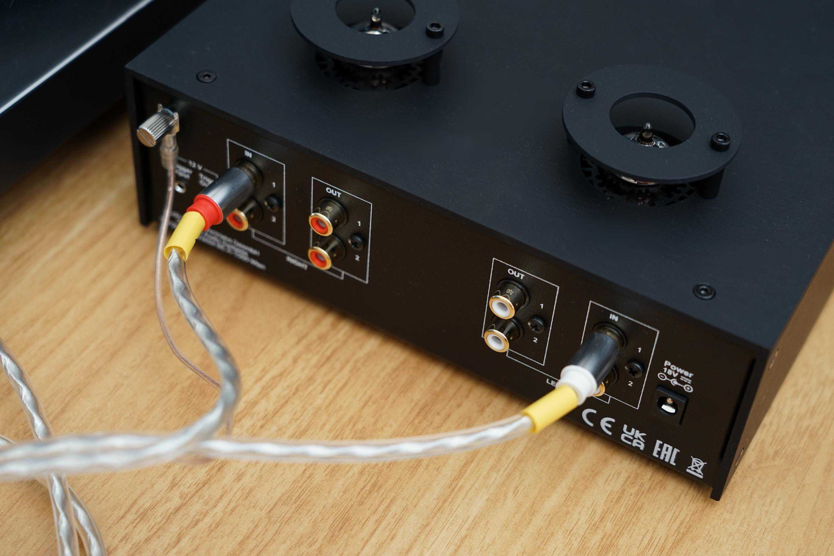 为了更好保留黑胶的原汁原味,我搭载了官方推荐的原装进口的宝碟TubeBoxDS2唱头放大器。这个前级胆机功放采用2进2出双路设计,搭载了两个俄罗斯金狮的ECC83双三极管高增益音频放大器电子管用来放大信号。并支持适合MC玩家的10~1000Ω阻抗调节、MM需要的47kΩ固定阻抗,电容匹配三档可调,且增益调节有45-45-50-55-60dB五档可选,可以满足各种唱头玩家对于个性化设置的需要。