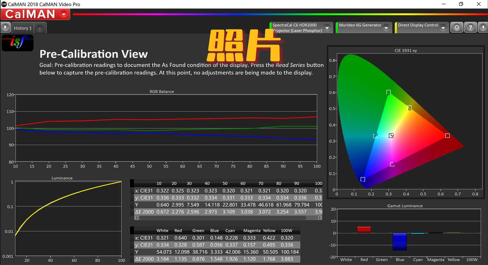 可以明显看出调试前RGB三色完全是不均横的,但亮度更高。而调试后亮度下降了10%左右。但好在100cd/㎡对于XW5000投射在160英寸1.4增益的透声幕上,确实也算是优秀的成绩。