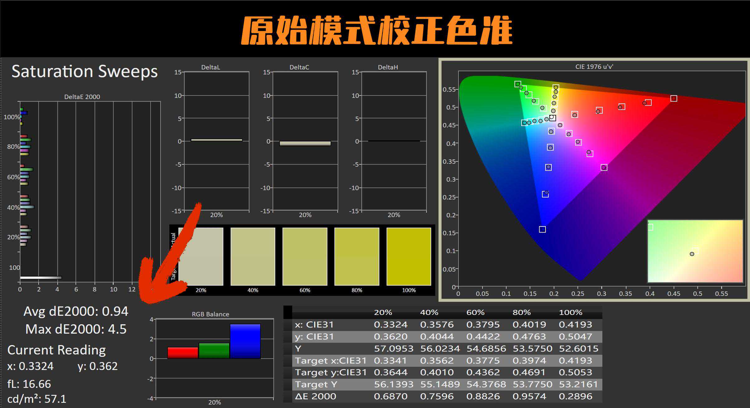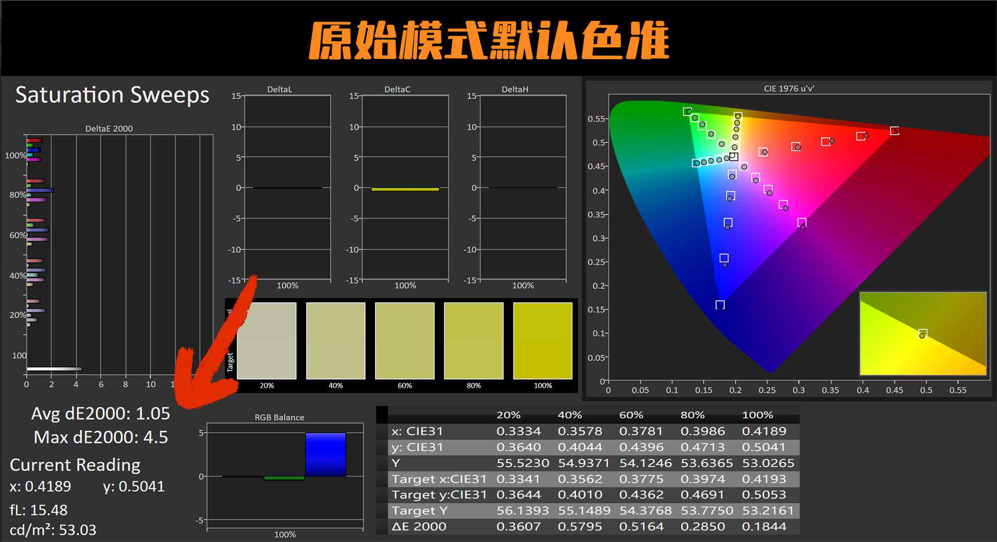 在什么都没有调试的情况下,原始模式平均色彩失真仅有1.05。