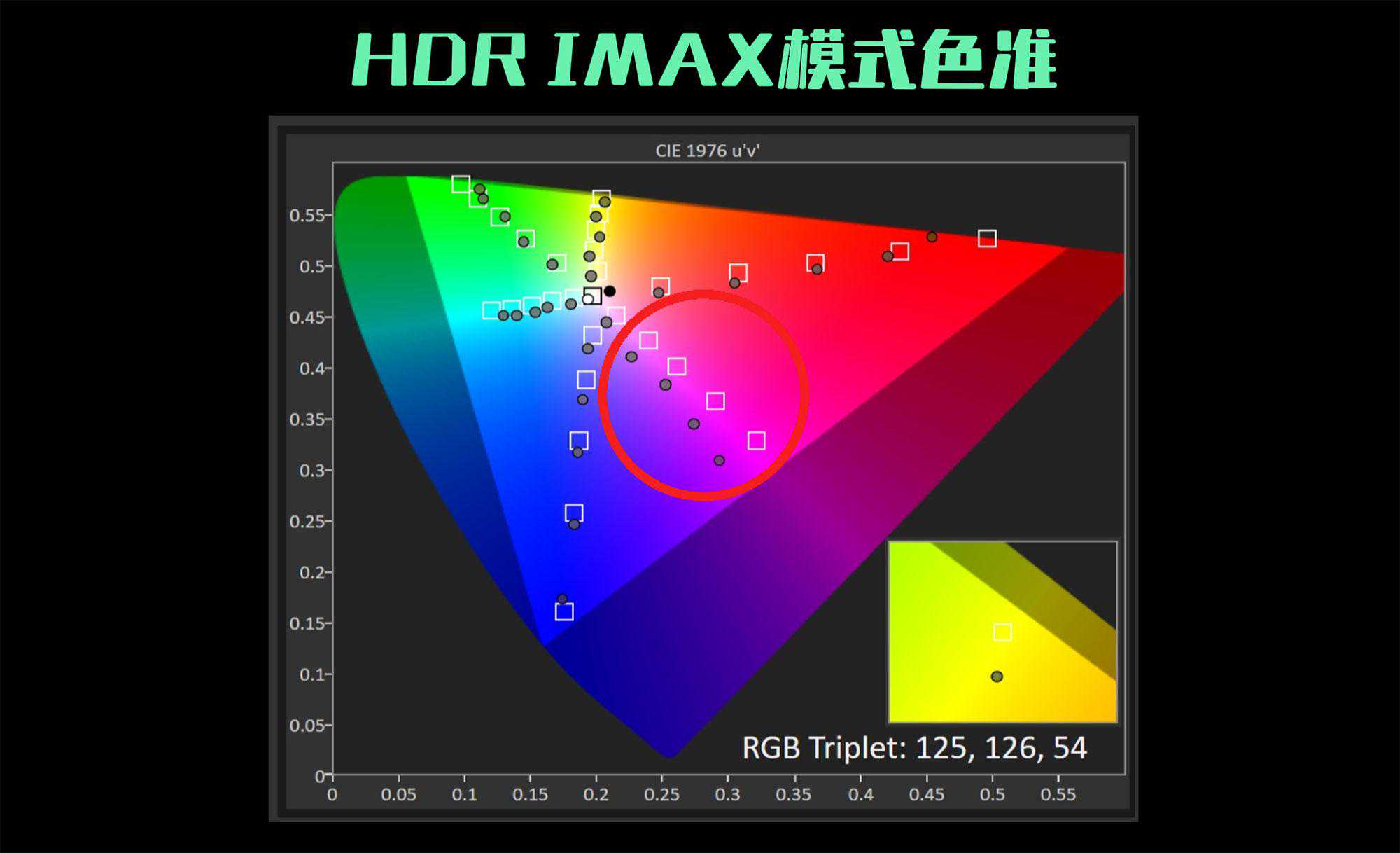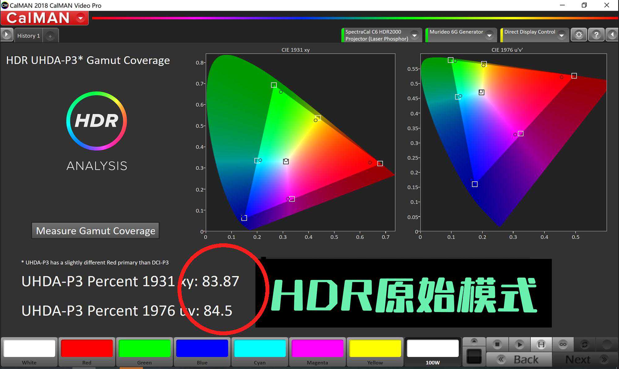 HDR原始模式在1931和1976两个标准下,P3色域覆盖率也就83%和84.5%,实际上这就差不多是709的范围。所以,HDR模式下,原始模式是明显不适合的。