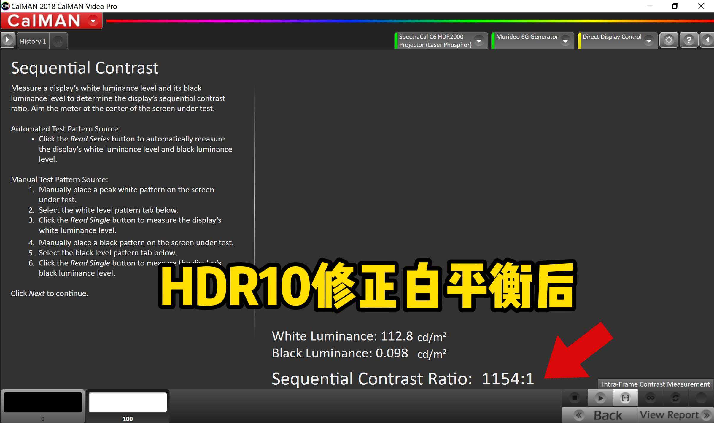 开始我以为是11万:1,但后来我发现不太对,那个:1没有写出来。后来我仔细一想不对。HT6550的黑色亮度测出来是0.09cd/㎡,112.8cd/㎡除以0.09cd/㎡,1154:1,这没毛病。