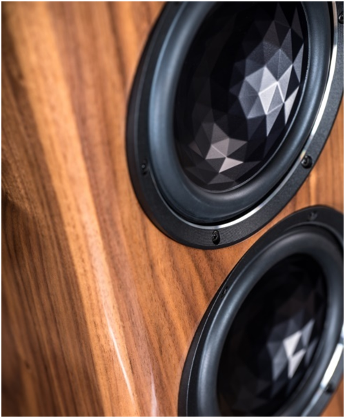 至于中音和低音单元的振膜也是。ELAC将铝和纸盆结合成三明治的复合振膜,如此一来,振膜本身一面具备了纸盆的高内阻,还具有铝质的高刚性,鱼与熊掌兼得。但是,单元在运动的时候,振膜难免会因为应力而变形,这个就是盆分裂。为了减少盆分裂的发生,振膜材质就要够硬。或者,可以靠立体的几何形状来提升刚性?因此,他们将振膜压出了三角形立体纹路,看上去,表面就像是钻石或水晶一样,因此这就称为水晶振膜,也是别无分号、只此一家,辨识度极高的特征。