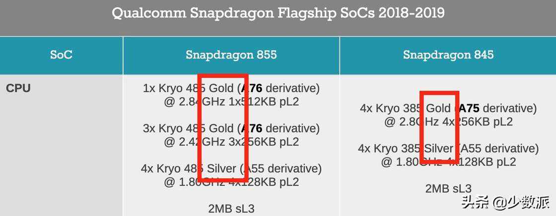 对于玩机用户来说,常常会在查看内核信息时看到Goldcluster/Silvercluster这样的字眼,可以将这个「金银簇」理解为SoC的大小核心集。查看下图来自Anandtech的表格我们也能够发现这样的称呼,对于使用三丛集的855来说,就会拥有两个Goldcluster。