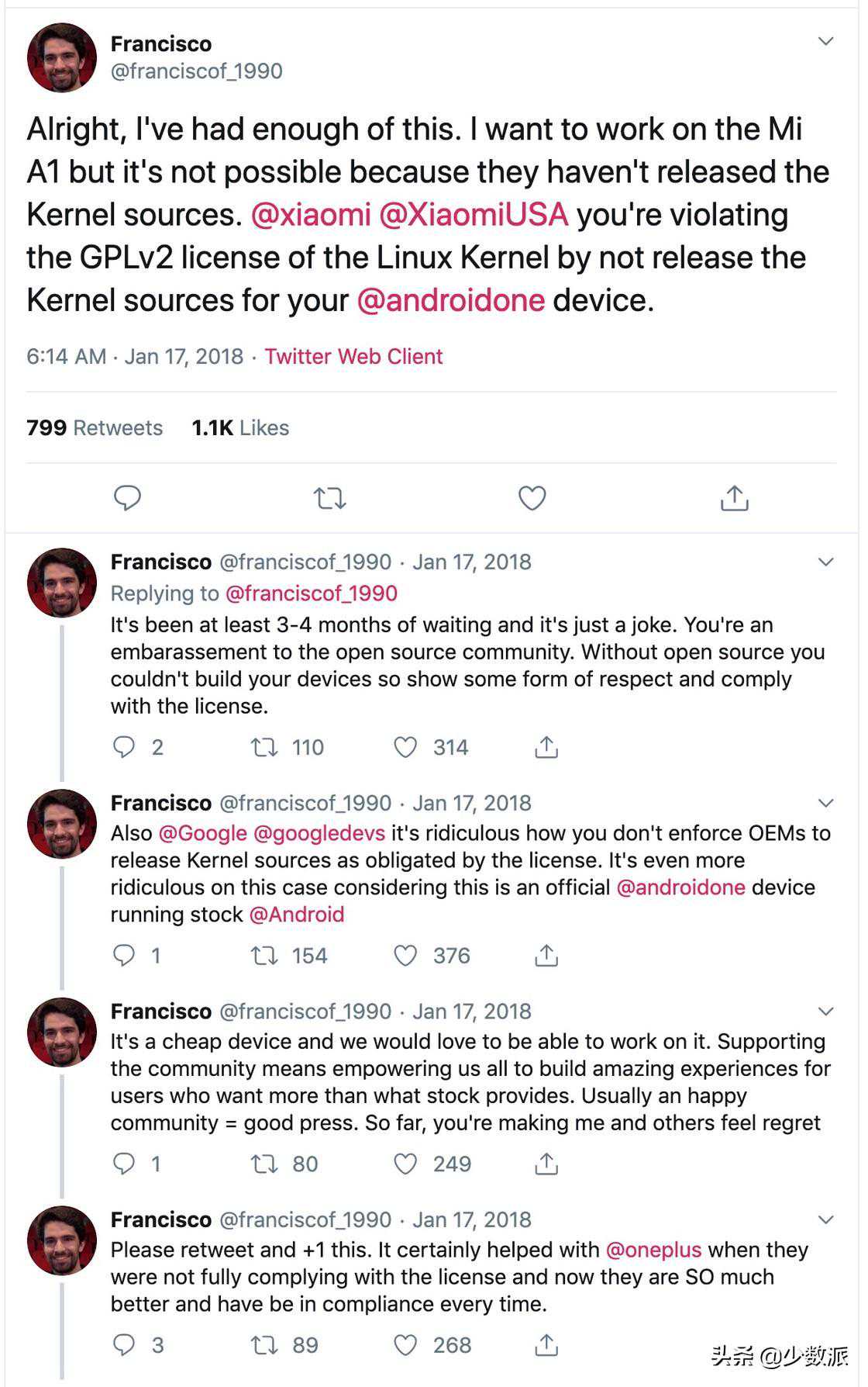 对于注重国际声誉的厂商来说,在机型发布后立即释出对应的内核源码已经是一项惯例。一个反面例子是,小米A1在推出后迟迟不释出源码,被媒体和开发者几近口诛笔伐。或许是这份压力的缘故,近年来小米的内核释出速度已经有所改观。