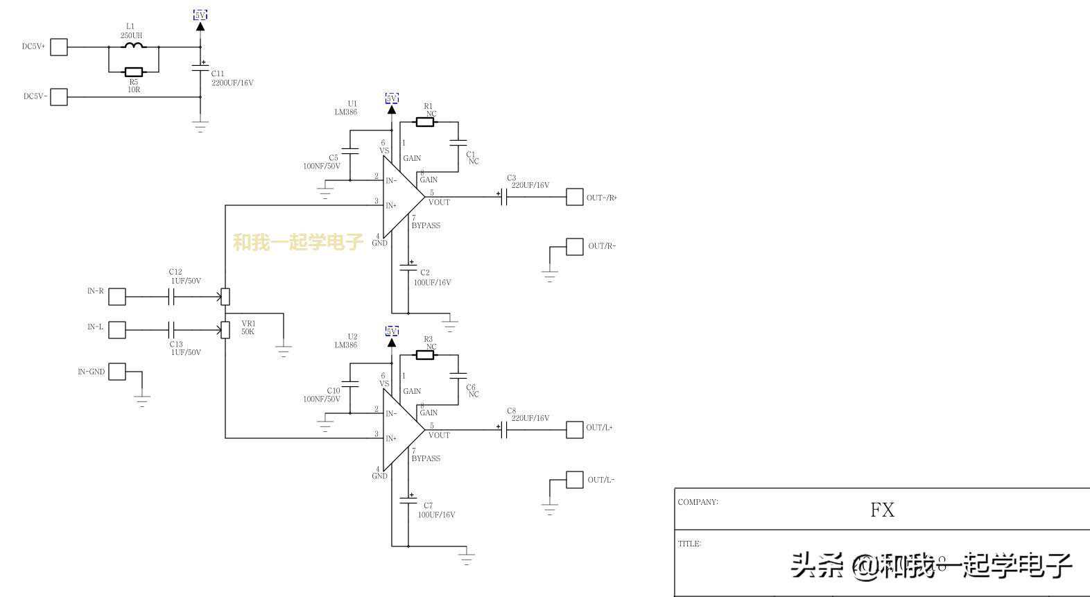 接下来就是使用电路设计软件画出完整的电路即可,下图是作者画好的电路图,因为有左右声道,所以需要两个放大电路。接下来会一部分一部分介绍电路图各处的作用以及为什么要选用这个器件