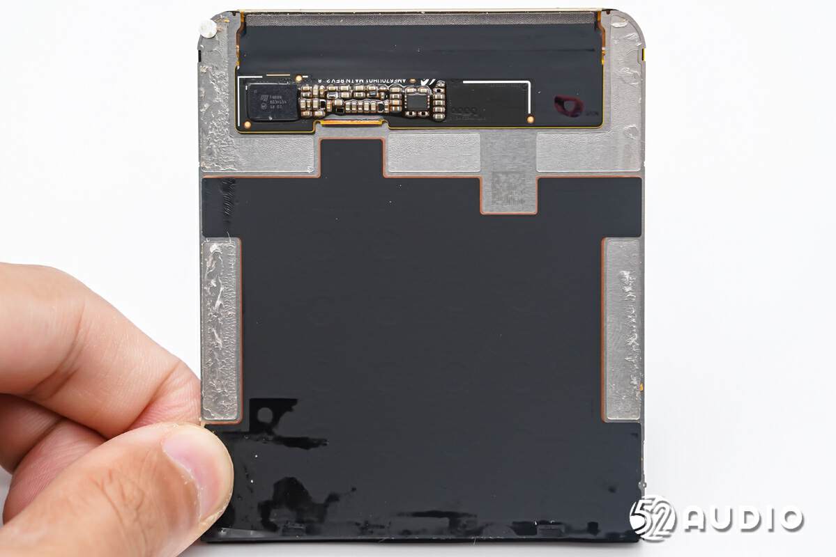 通过磁显片,可以发现屏幕四角设置有3对6颗磁铁单元,其中外侧2对4颗用于折叠时对吸,实现稳定的固定;内侧1对2颗用于磁吸感应,实现手机展开/折叠时自动开启或关闭屏幕。