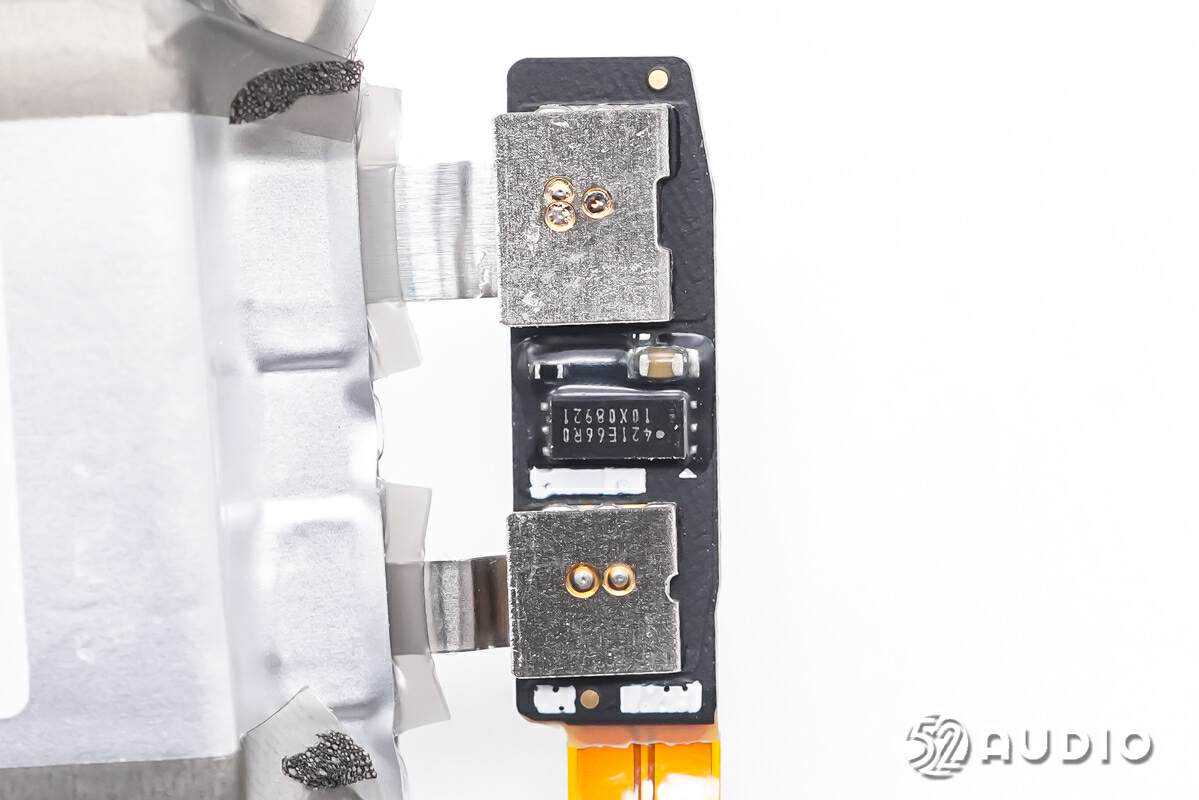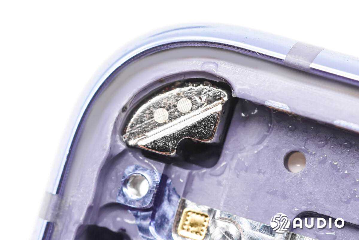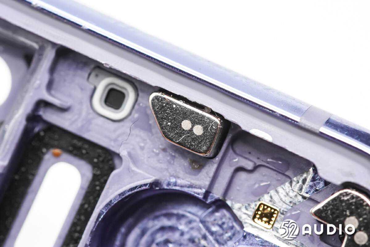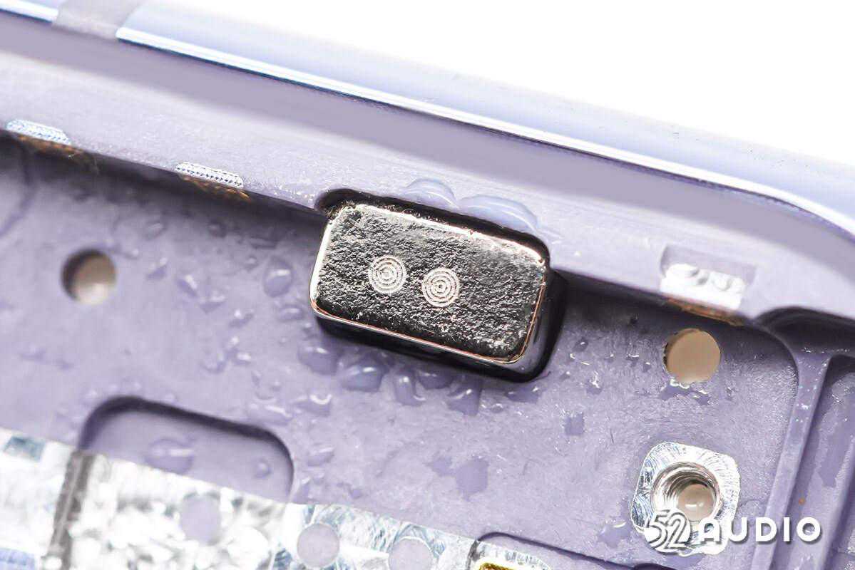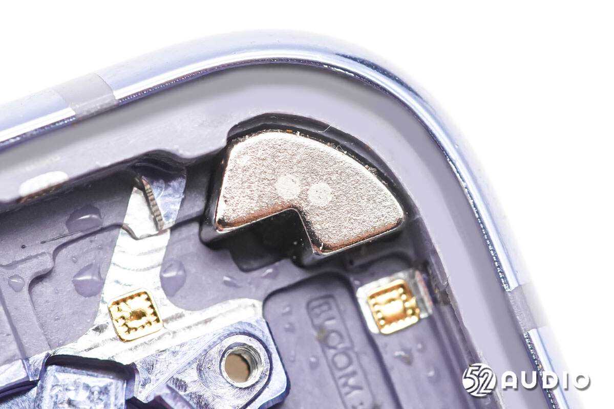 右上角的磁铁特写,采用了契合腔体的异形设计,高精度的尺寸和适当的材料选型满足吸力要求。与右下角的磁铁呈相对向异极,主要作用为磁吸附,保障折叠屏手机开闭屏时的稳定性。