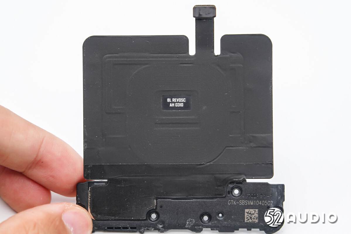取掉手机背部下方盖板,下方设置有无线充电接收线圈模组和电池单元。