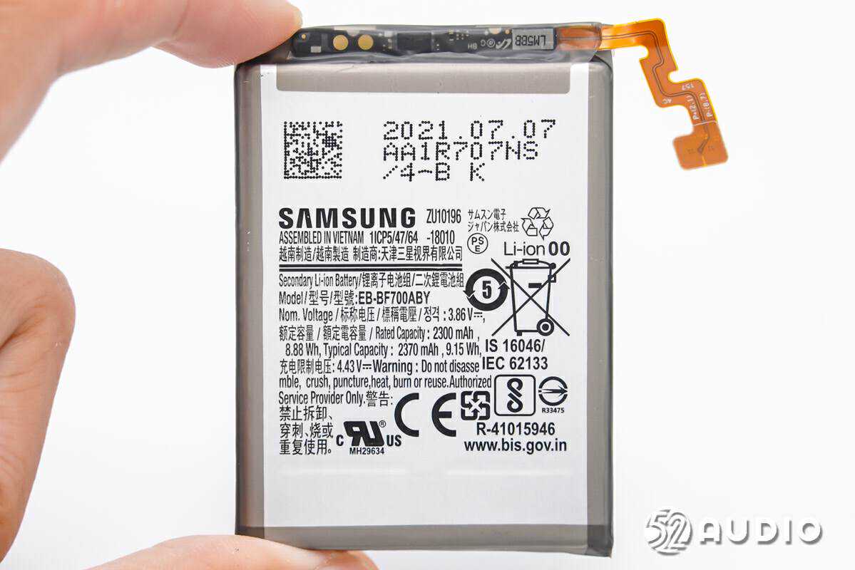下方腔体内置锂离子电池组,型号:EB-BF700ABY,标称电压:3.86V,额定容量:2300,充电限制电压:4.43V,制造商:天津三星视界有限公司,越南制造。