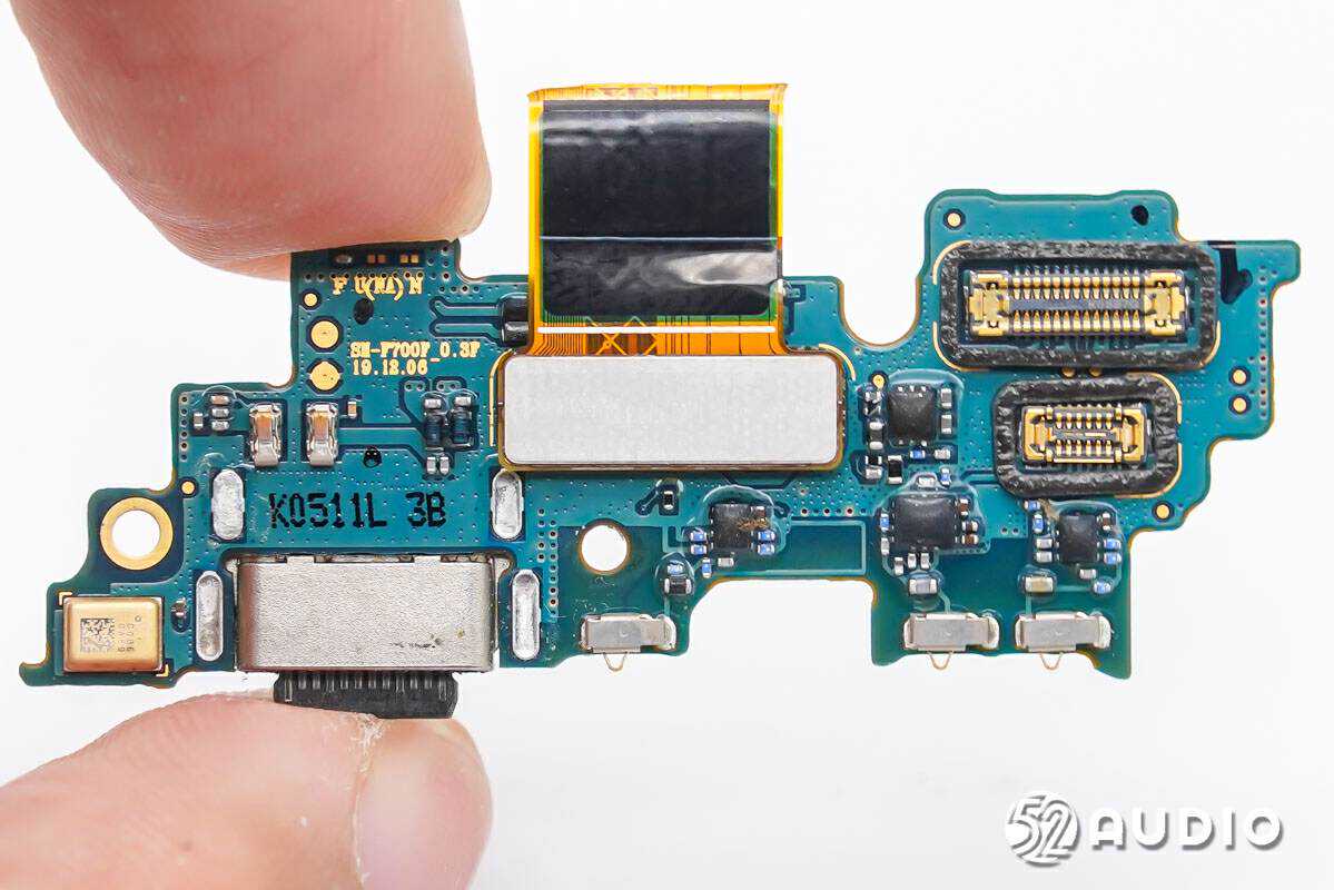 内部结构配置方面,三星GalaxyZFlip拥有着极高的集成度和模块化设计,元器件之间均通过连接器连接,便于生产组装和后期维修;上下腔体内主副板之间通过一条主排线穿过铰链连接。上方腔体内置主板单元和三星视界900mAh锂电池组,搭载通知屏幕、三摄像头、振动马达、听筒和降噪麦克风;下方腔体内置无线充电接收线圈,三星视界2300mAh锂电池组,以及扬声器和通话拾音麦克风。