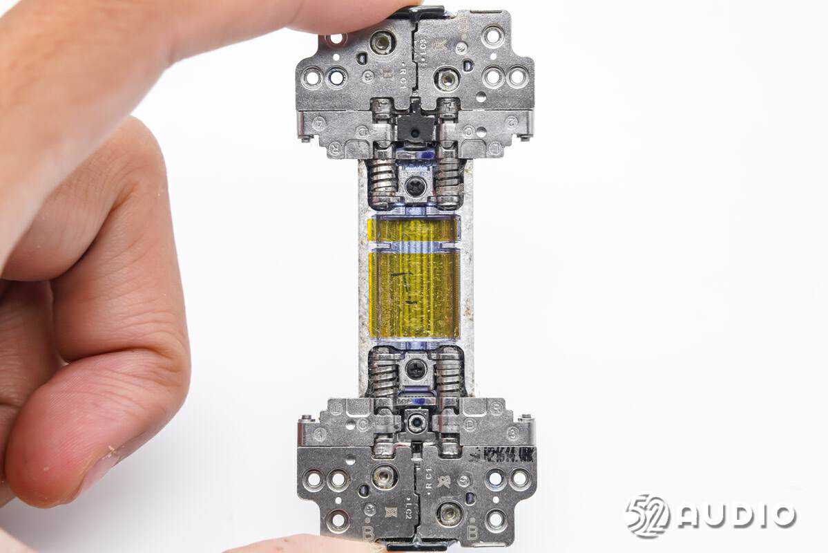 腔体内部结构一览,元器件通过塑料支架和金属压板固定,腔体内部同样设置有一块电池。
