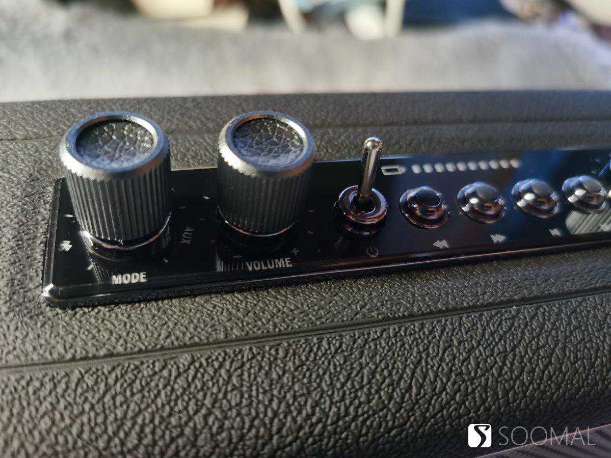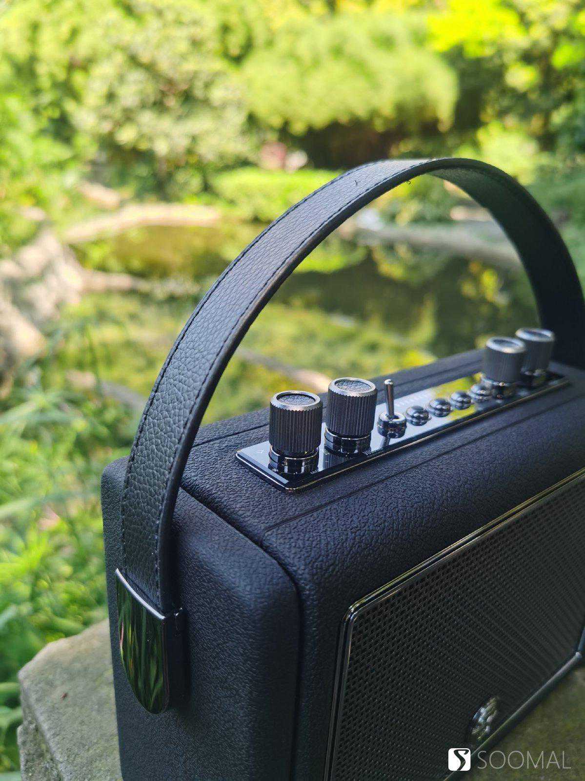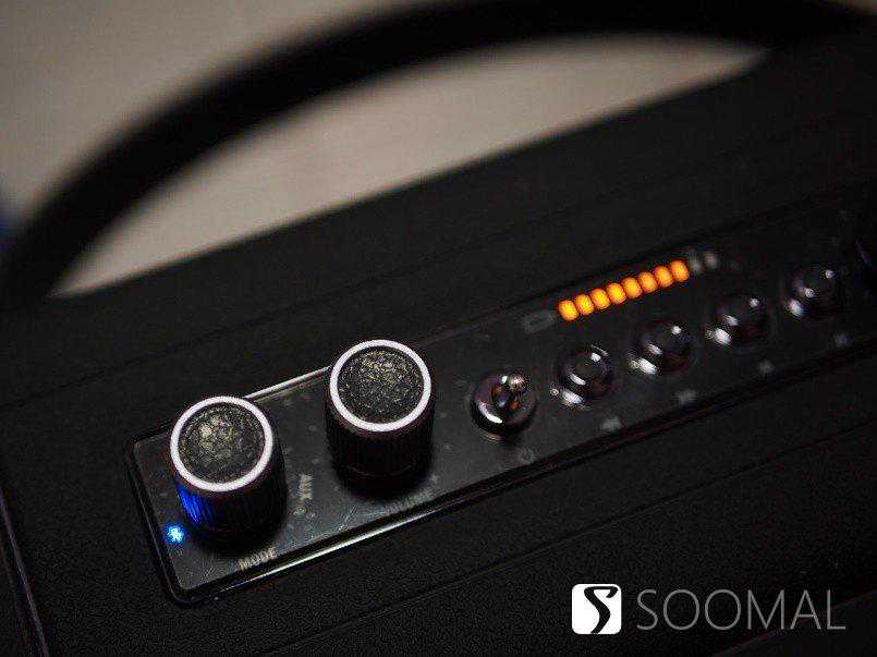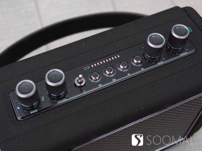 音箱重量3斤左右,拿在手里颇有质感,箱体拼缝仔细看了一圈,都是严丝合缝,没有毛刺、割手和不均匀,把手的缝线也很规整,设计上有点像手提包。上面那几个旋钮和拨杆都是金属材质,做工也很细致,旋钮上方还填充了皮质纹理,手指调节的时候有明显的段落感,有清脆的金属“哒哒”声,没有明显的旷量,是一种紧致的感觉。