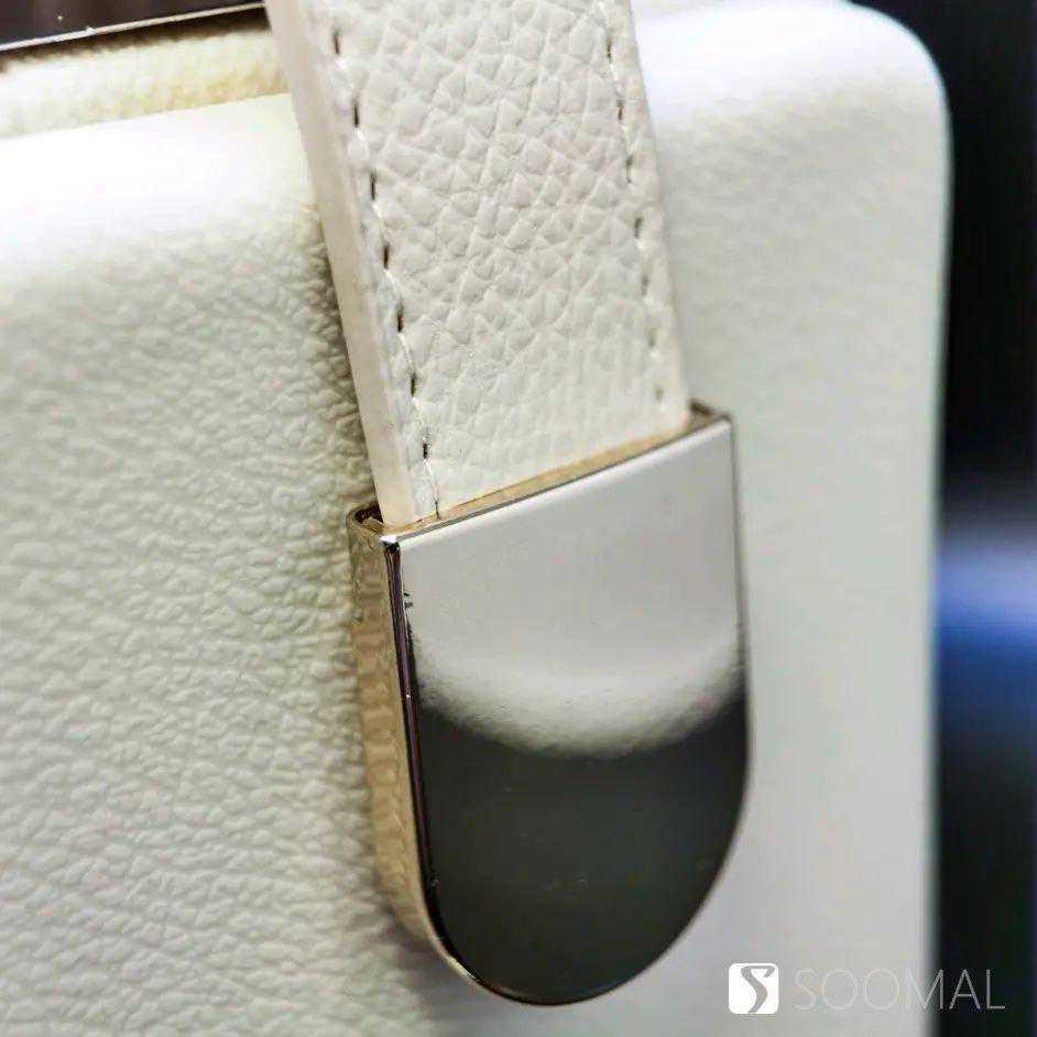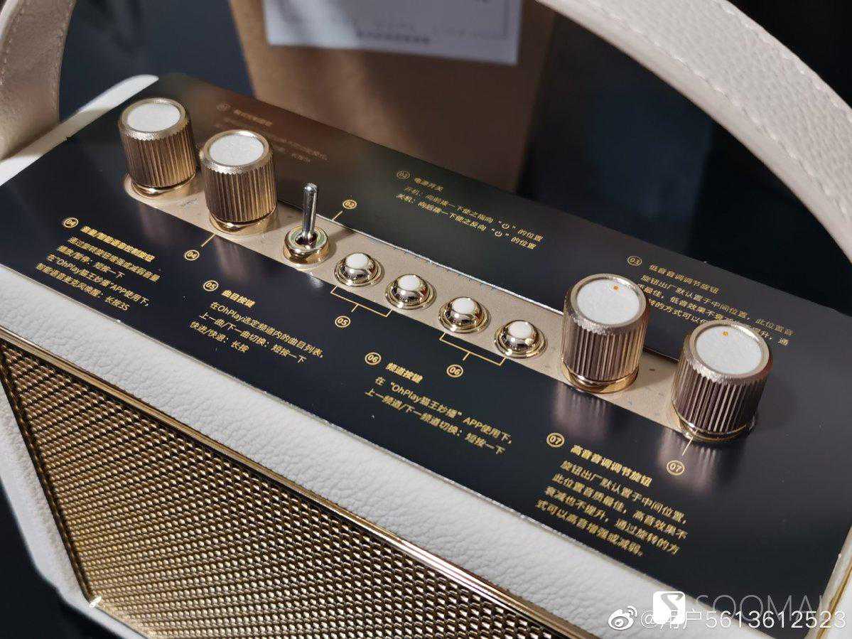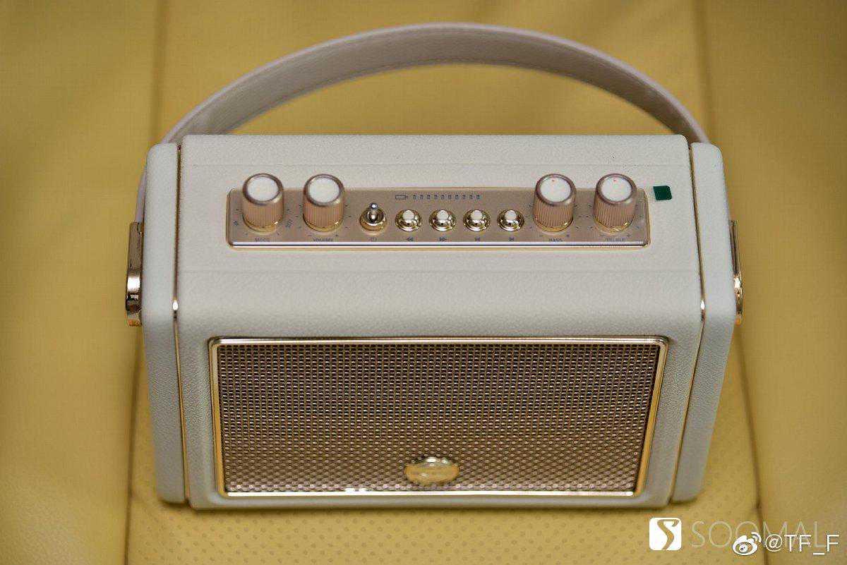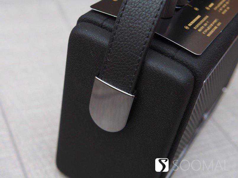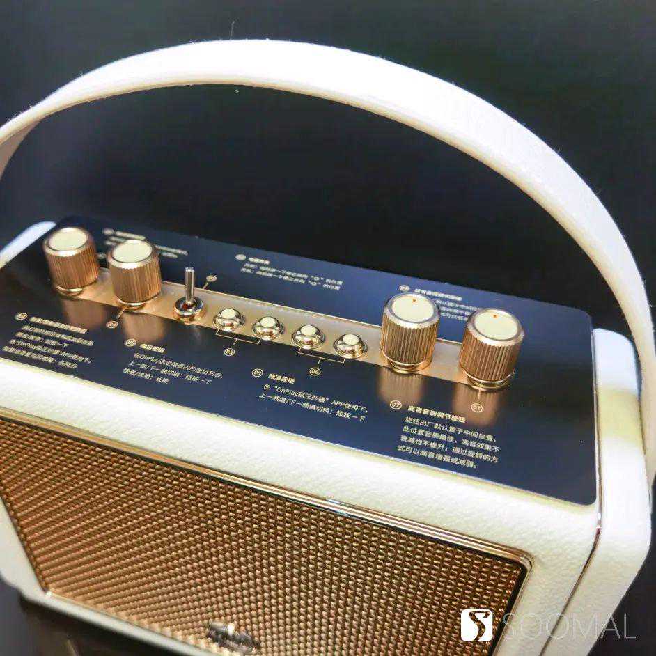 猫王Mate3使用一根仿皮质拎带通过镀金金属扣搭配在音箱两侧,米白色的主色调搭配上金色金属网格,并且在音箱边缘还有两条装饰镀金边条镶嵌,整体感觉非常别致有设计感,有点女士用的真皮拎包的既视感,而且因为重量控制的也不错,真对女性用户来说拿取使用也没有任何负担。