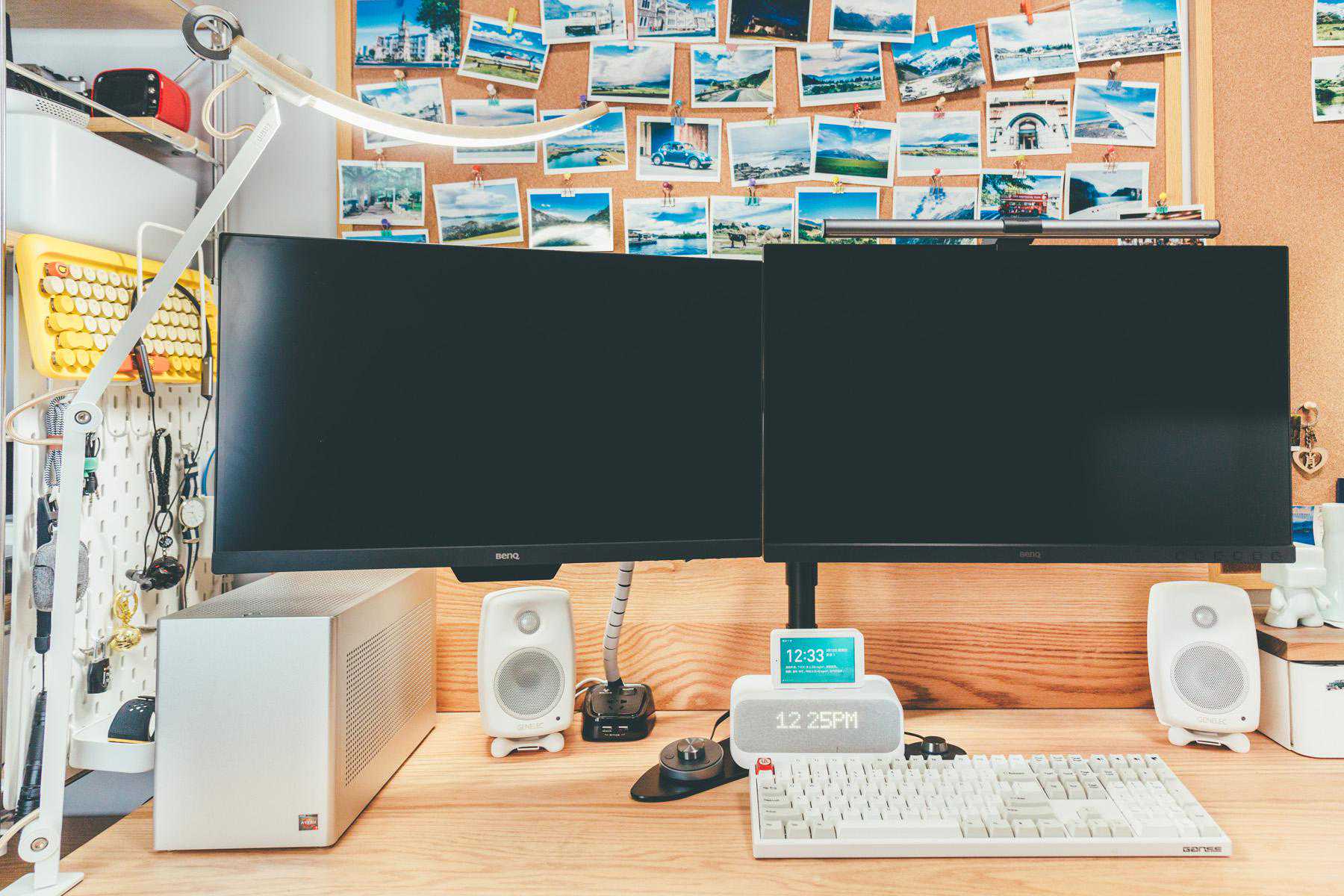 桌面彻底清爽了,只是抛弃原来明基SW270C优秀的底座有一些遗憾,还是希望明基能尽快出自己的双屏显示器支架。