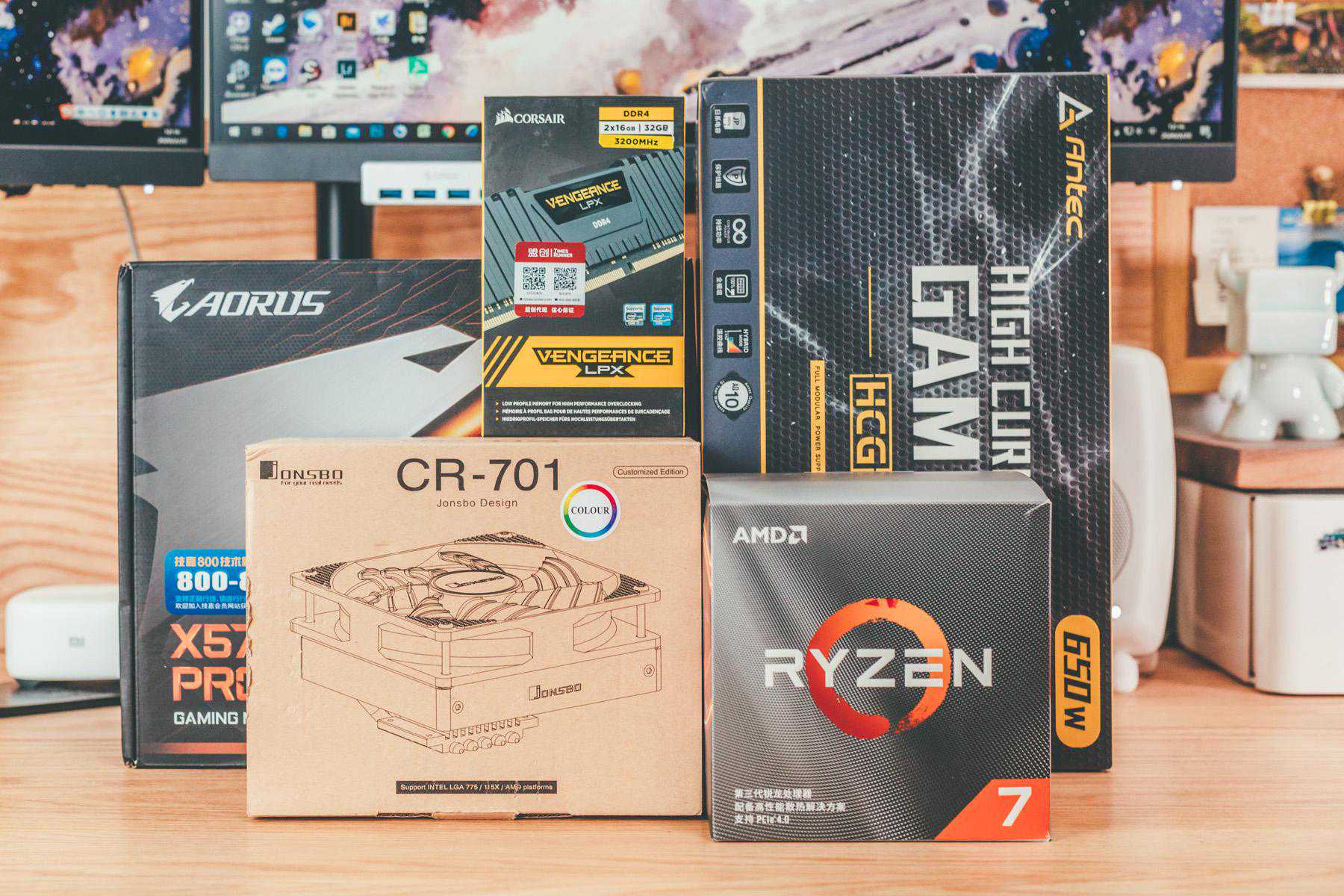 最开始的配件图,后期置换了乔思伯散热器,增加了蓝宝5700XT。