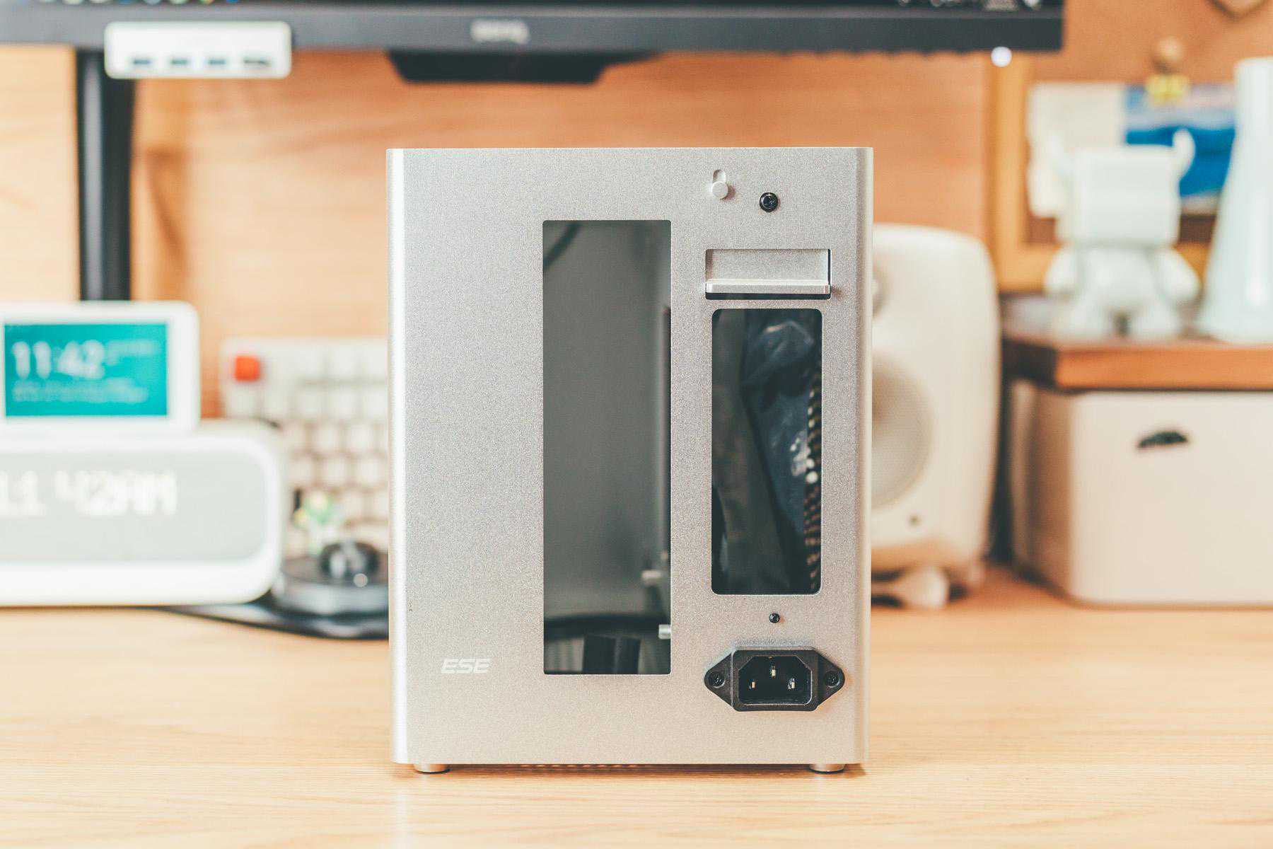 近期桌面大升级,除了因为原来机箱太高太窄的元素,原本机箱是全黑也不符合我的白色控缘由,白色机箱比较少,银色作为替代也可以,另外和我之前装ITX理由一致,我是根据空间来选择机箱的,蜂鸟ESE完美契合我预留的主机空间。
