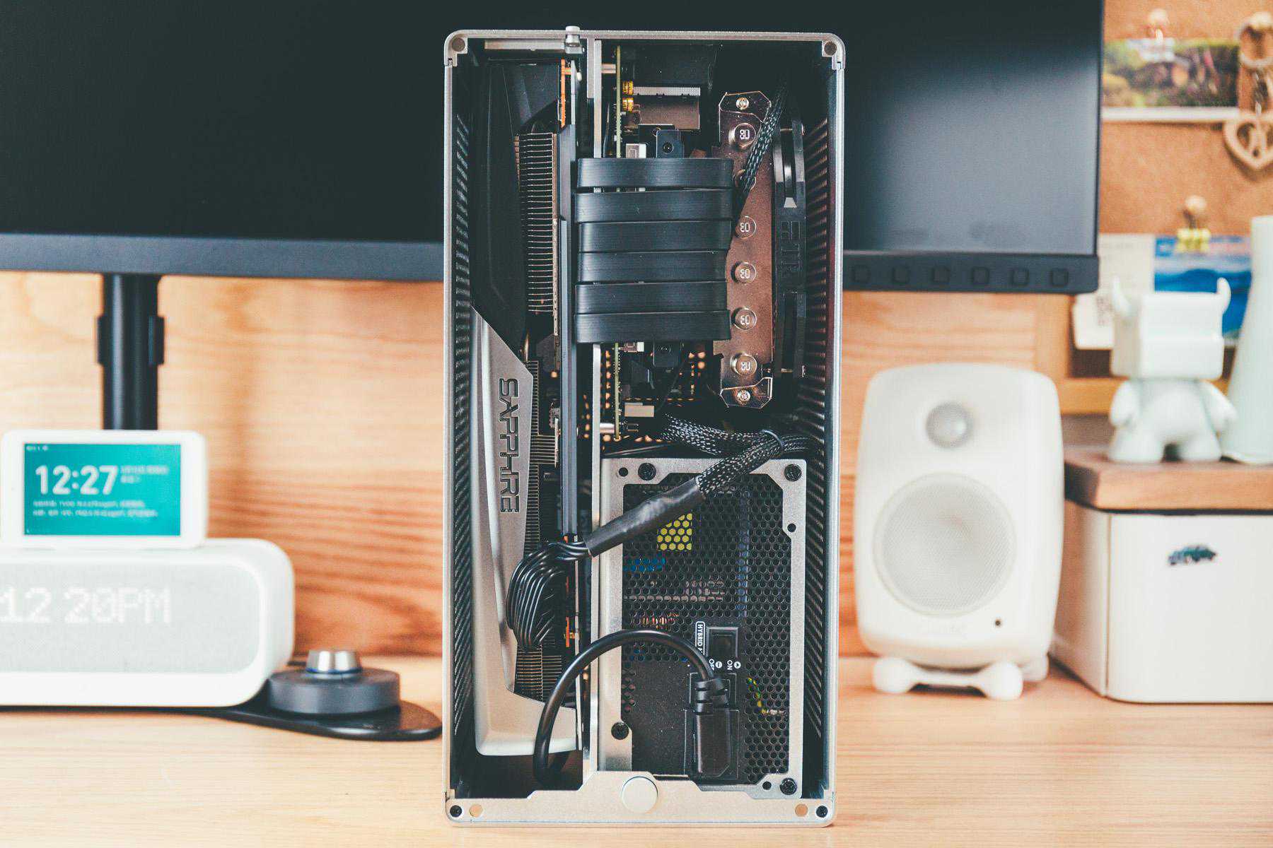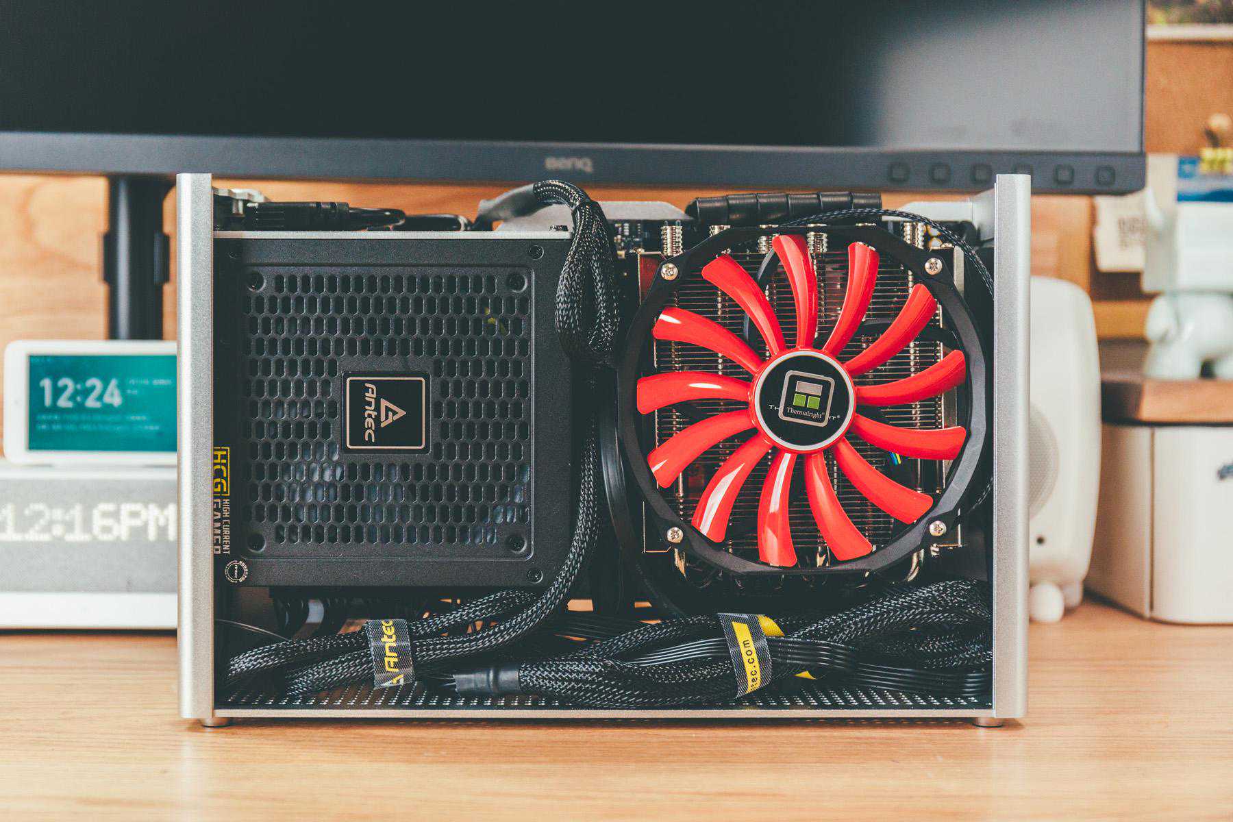 基本上空间被填的满满的,这也是ITX折腾的地方之一,你无法预料到哪一步会翻车,而且选购配件需要深思熟虑,比如我这台主机,如果不是转接显卡延长线,利民这款散热器根本用不了。