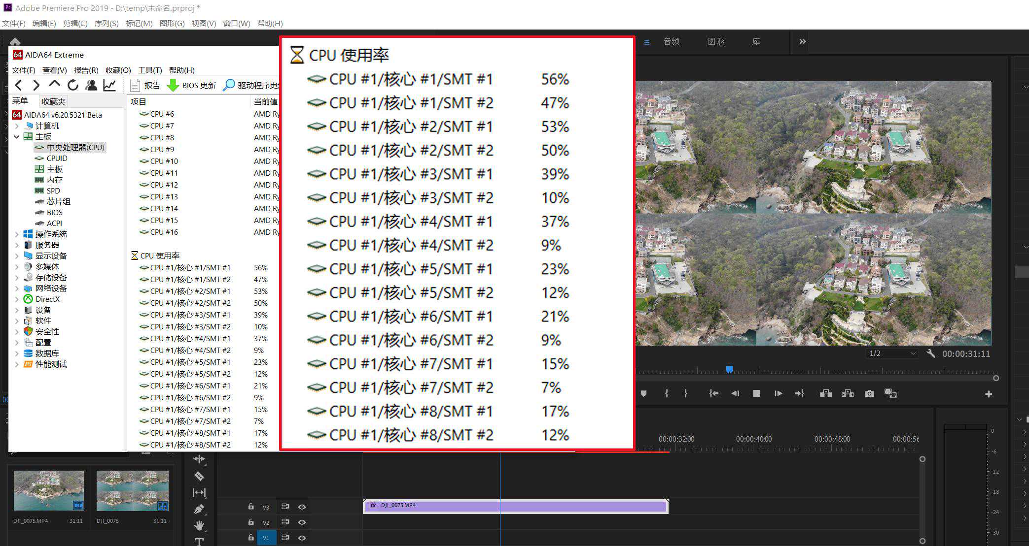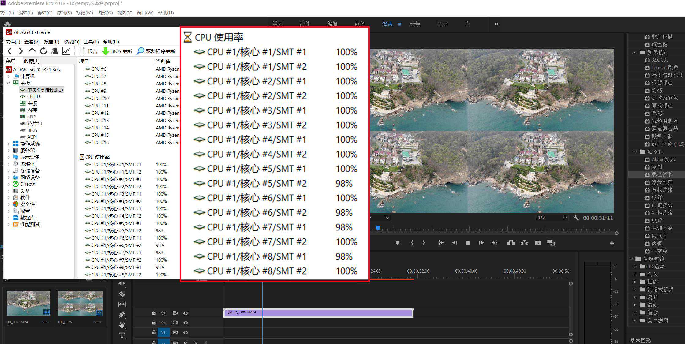 但是进行渲染操作的时候,CPU立马满负荷运行,这也可以理解,毕竟是四个4k素材同时进行渲染,不过这和lightroom一样,虽然峰值是100%,很快就会掉下去,而且依旧可以进行其他常规程序的运行,不会完全卡死。