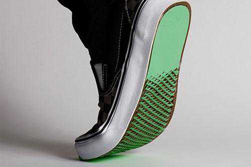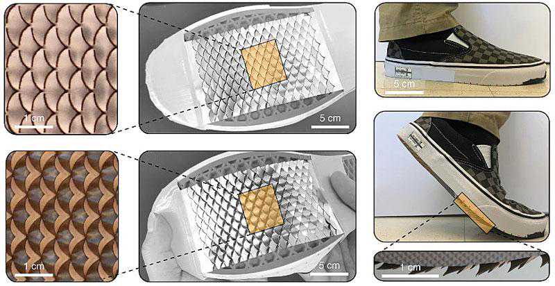 受此启发,研究者借鉴了剪纸艺术,开发出一种类似“蛇鳞”的防滑鞋底结构。当穿着此鞋的人保持静止不动时,不会带来任何影响;而在行走过程中,鞋底弯曲激发起“鞋钉”凸起,可以有效增加摩擦性能,降低穿着者滑倒的风险。