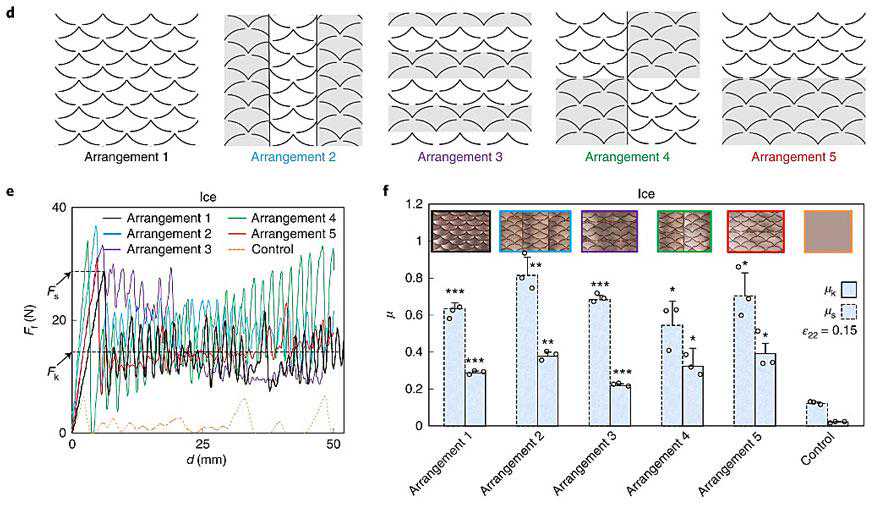 与此同时,“鞋钉”的排布方式也至关重要。研究者测试了五种不同的凹型“鞋钉”排布方式,在冰面实验中,均呈现出不同程度的摩擦力增强,平均静摩擦系数增加5倍,动摩擦系数增加15倍。