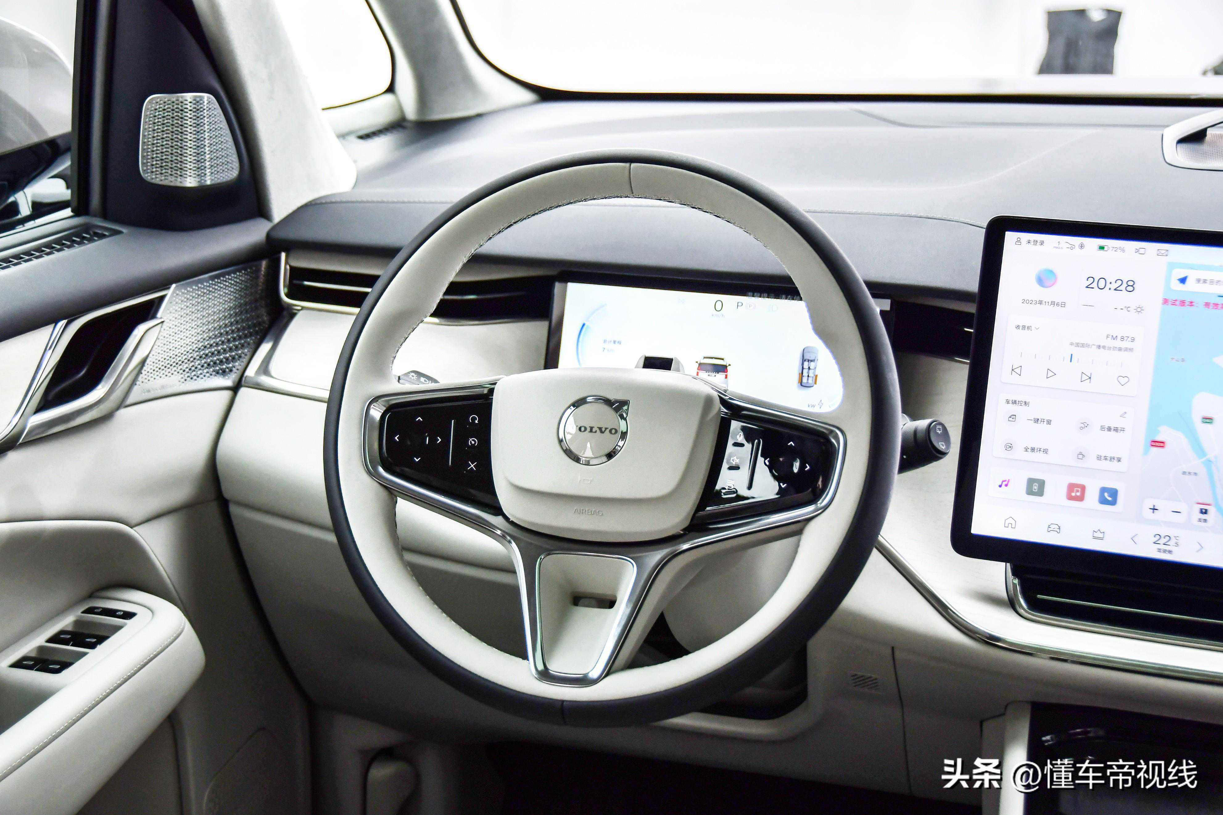 三辐式多功能方向盘同样采用了皮质包覆,多功能按键则应用了触控设计。该车还搭载了大尺寸的悬浮式全液晶仪表以及悬浮式中控屏,中控屏还采用了偏向驾驶位一侧的设计,更利于驾驶员查看屏幕上的信息。此外,沃尔沃EM90还配备了水晶挡把,为车内增添了一定的精致感。