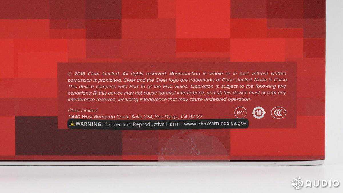 底部有cleer商标和产品符合FCC标准第十五部分说明,以及BC、CCC认证标志。