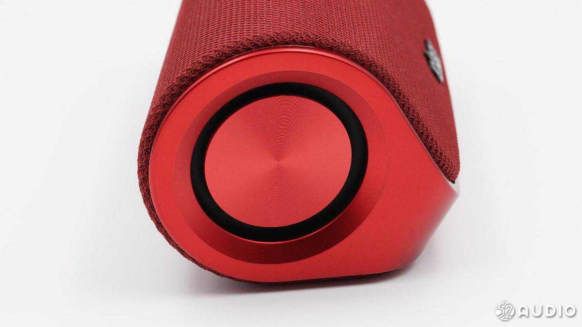 音箱侧边金属辐射振膜特写,背板做了CD纹处理。