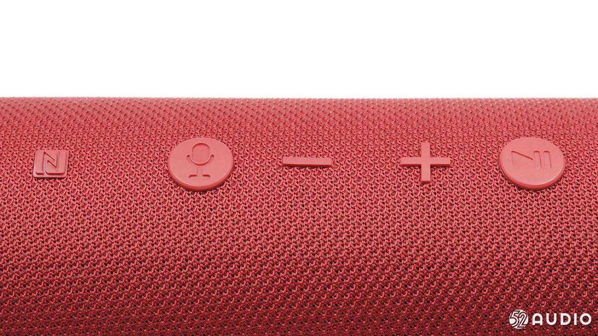 四颗功能按键依次为麦克风、音量减、音量加、暂停/播放/接听;左侧“N”标志位置配置有NFC感应器,与拥有NFC的设备接近实现快速自动连接。