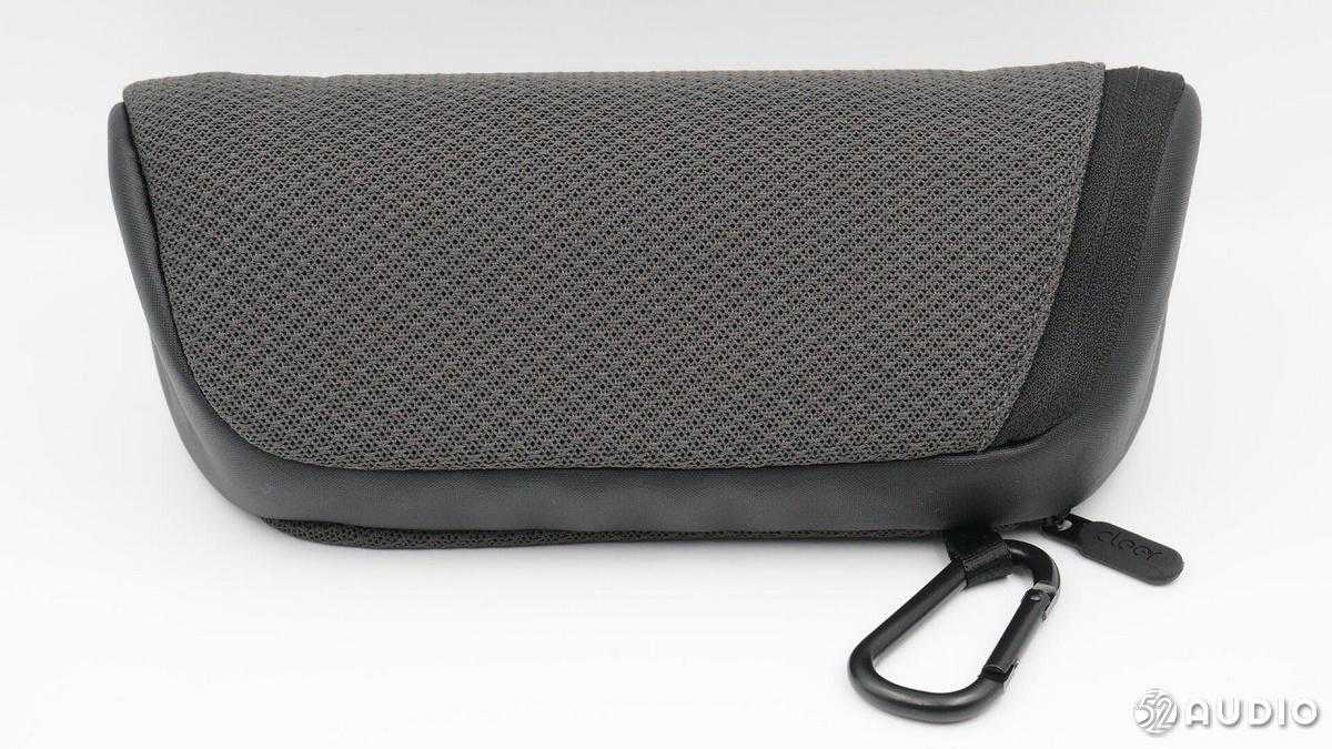 收纳袋设计与音箱一致,音箱骨架位置采用皮革材质,其余部分防尘网布包裹。