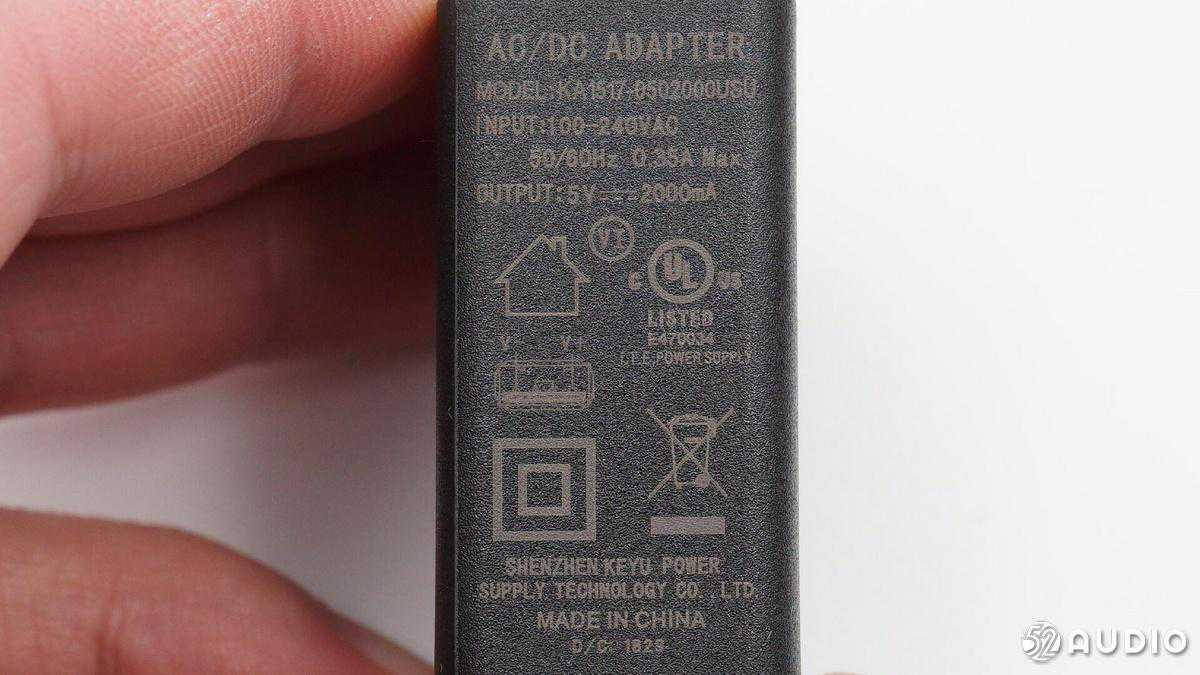 电源适配器侧边印制信息有产品名称:AC/DC:ADAPTER;型号:KA1517-0502000USU;输入:100-240VAC,50/60;输出:5V⎓2000mA等。