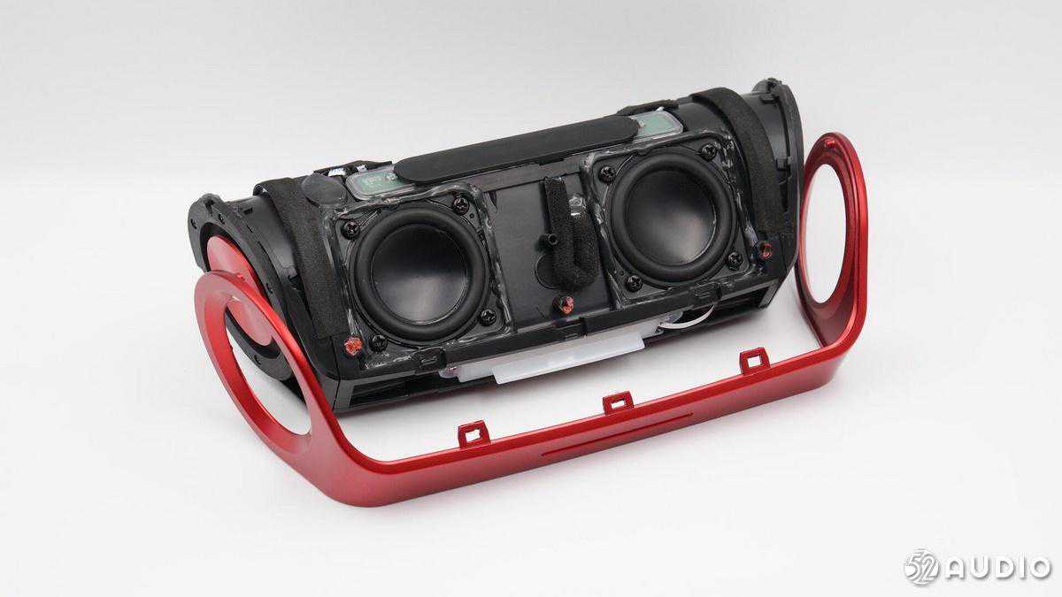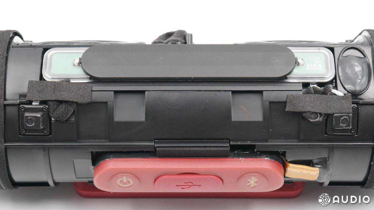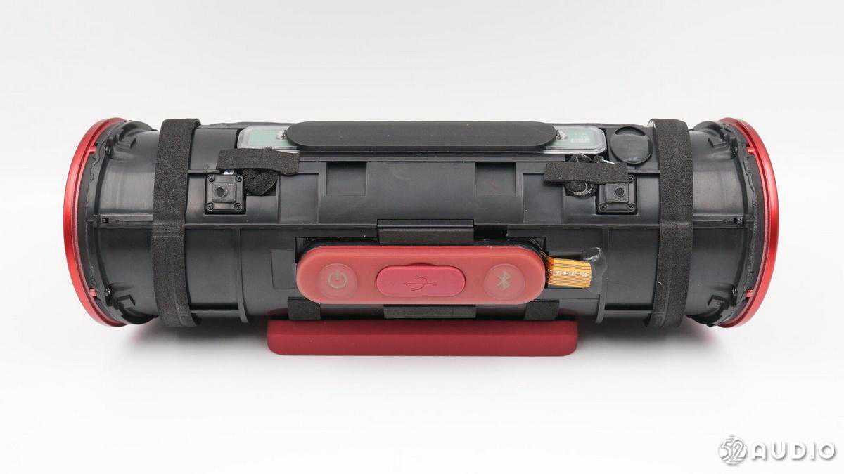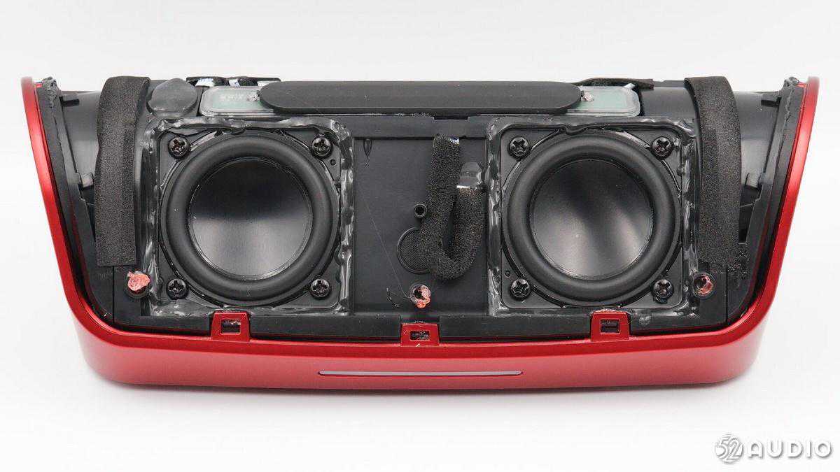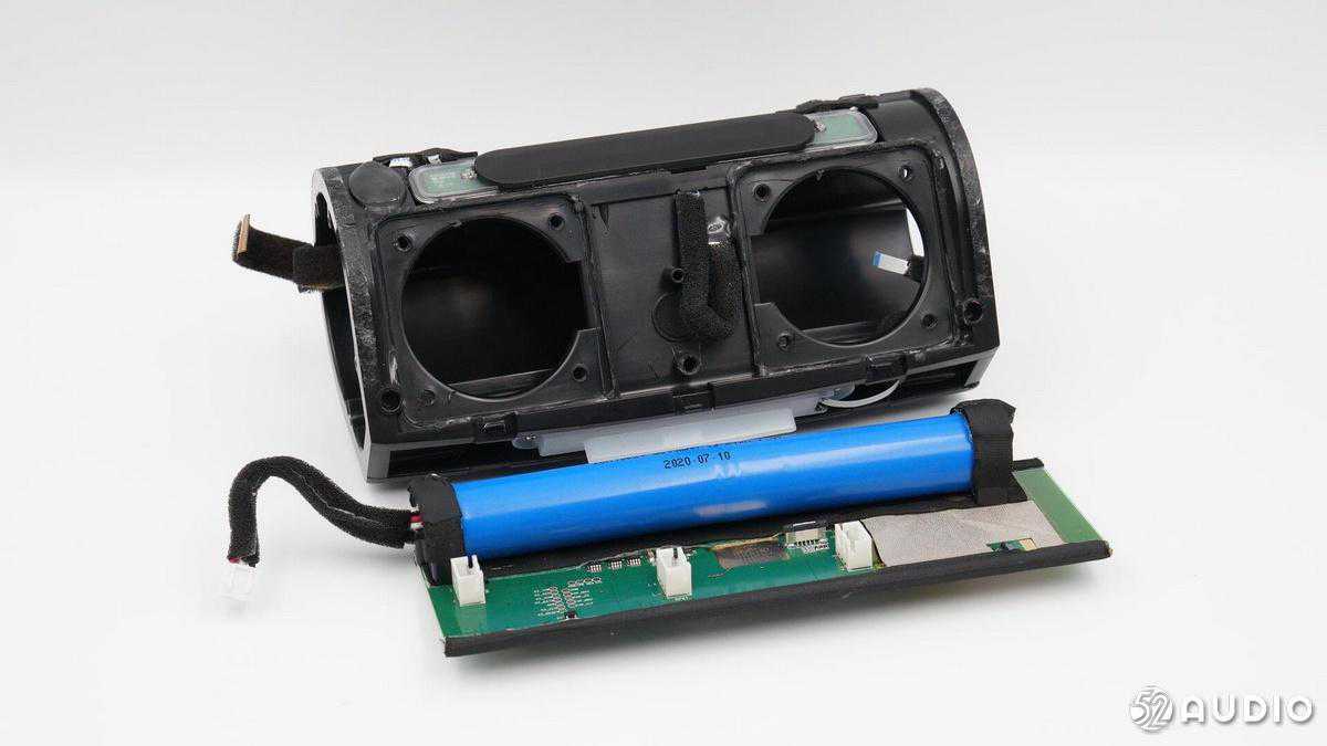 内部配置上,采用了两颗全频喇叭单元,左右两侧各搭配一个金属被动盆,结合德州仪器TAS571120W数字音频功率放大器,实现强劲的音乐体验;2串18650锂离子电池组总容量5200mAh,设置有双层塑料膜进行防水保护,并配备有电池保护板。