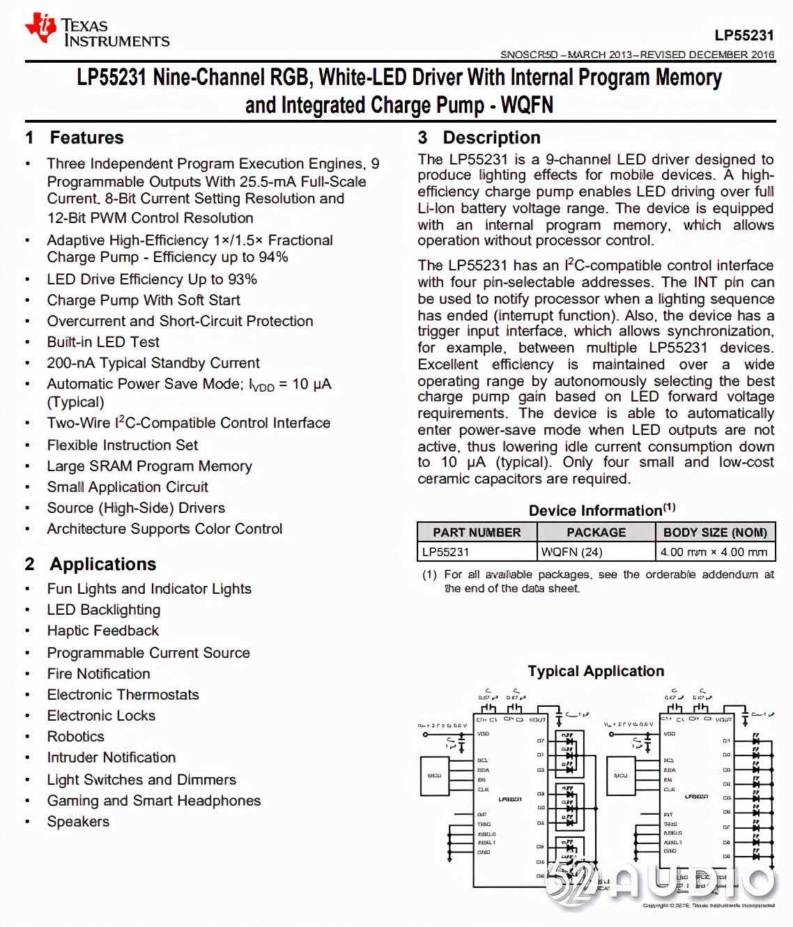 TI德州仪器LP55231可编程9通道LED驱动芯片,每个通道的电流大小、PWM控制都可单独调节,每个通道最大支持25.5mA的电流输出,拥有较高的驱动效率,专用于为移动设备制造灯光效果。