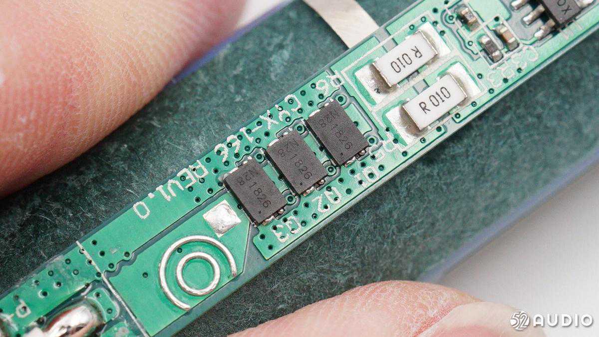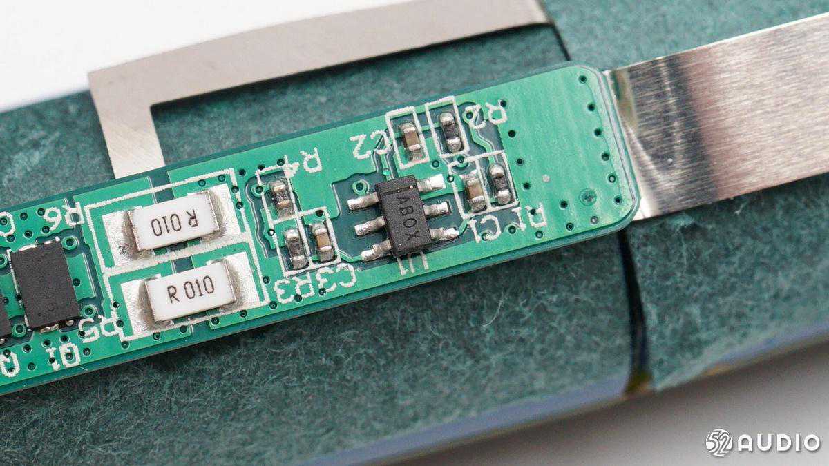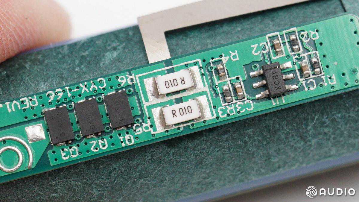 两颗R010贴片电阻并联,检测电池输出电流,用来过流保护。