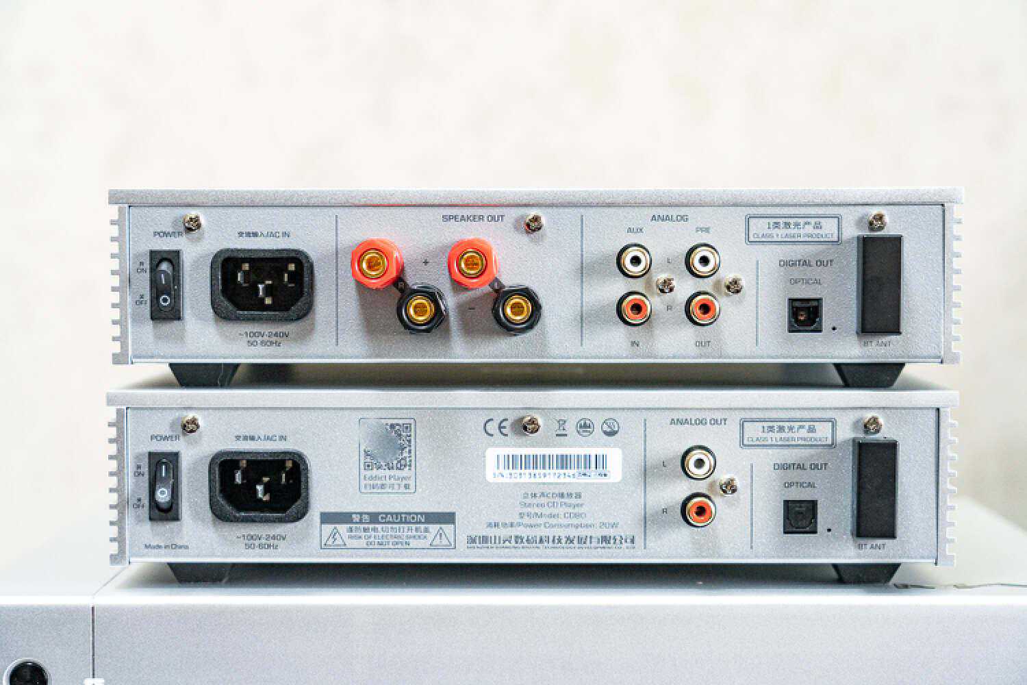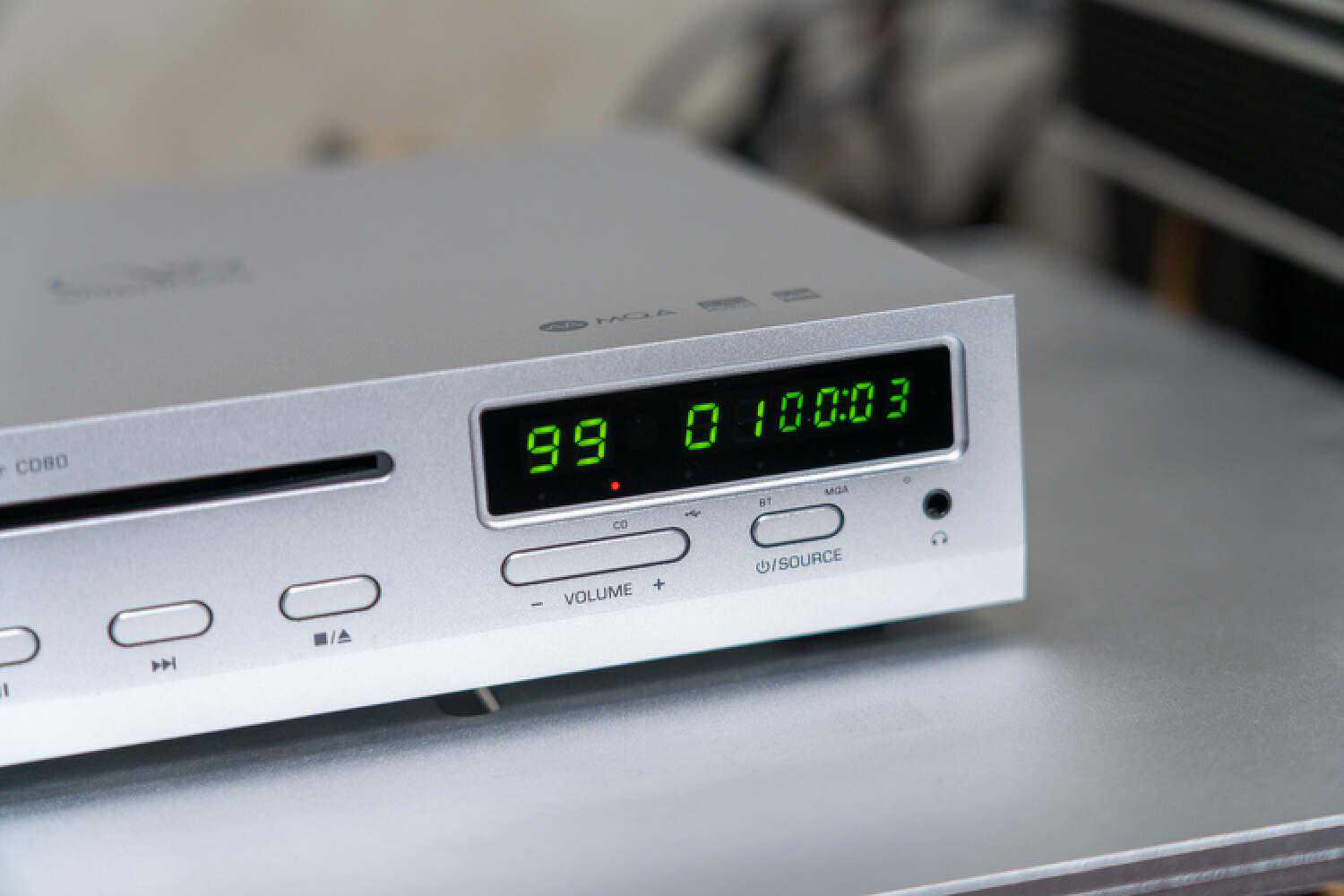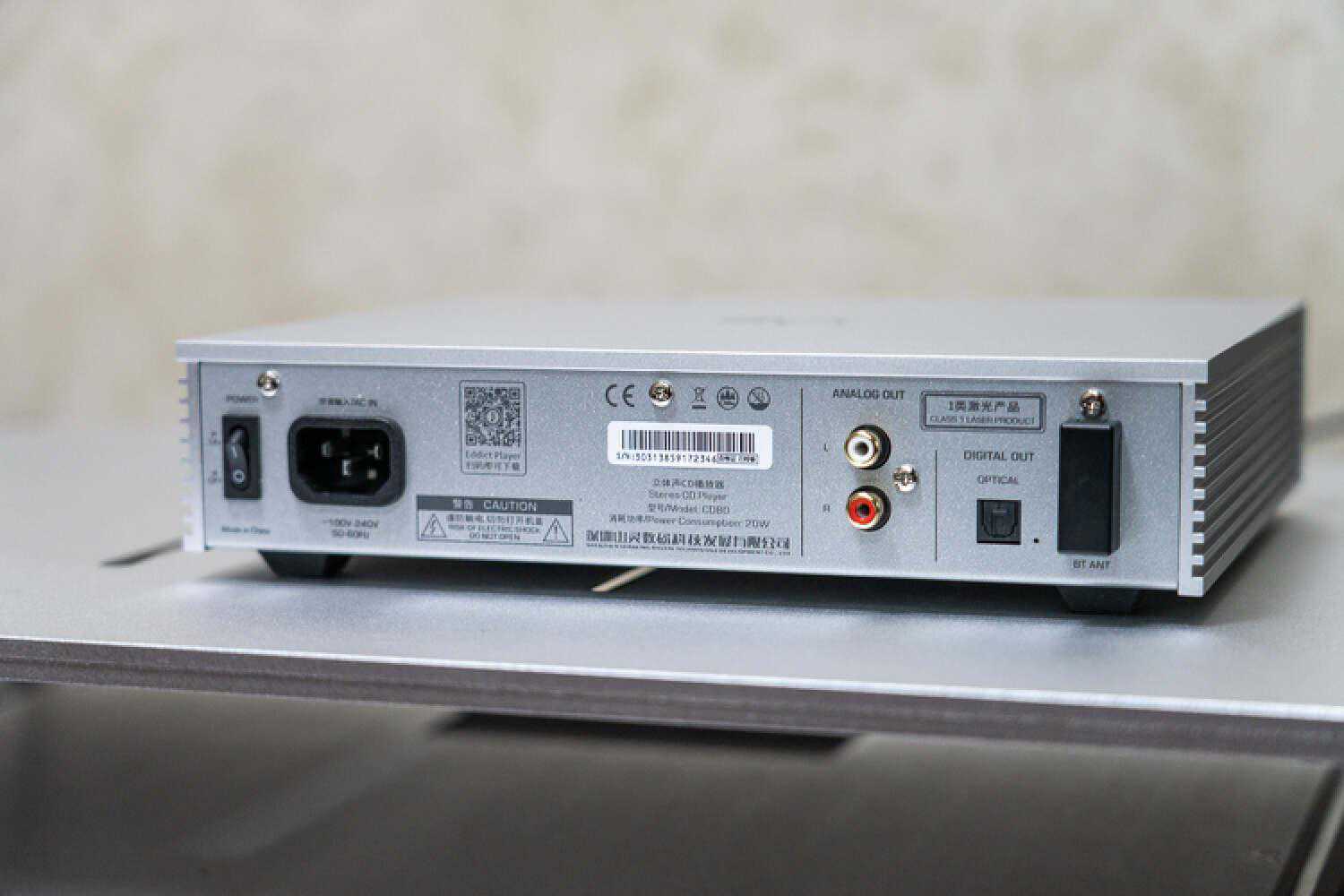 从背面不难看出,CD80没有保留太多的扩展接口,数字输出只有1组、模拟输出只有一组RCA,除此之外也就只剩了AC电源口和一个隐藏式的蓝牙天线了。当然了,CD80依然是保留了数字前级的功能,所以大家可以放心去接驳有源音箱,调节音量是不用担心的,蓝牙输入的规格也支持到LDAC。但这里注意,是蓝牙输入、而不是输出,意味着你可以用手机或者电脑发射信号给CD80来进行接收、播放,而不是把CD的信号源以蓝牙的方式发射出去。