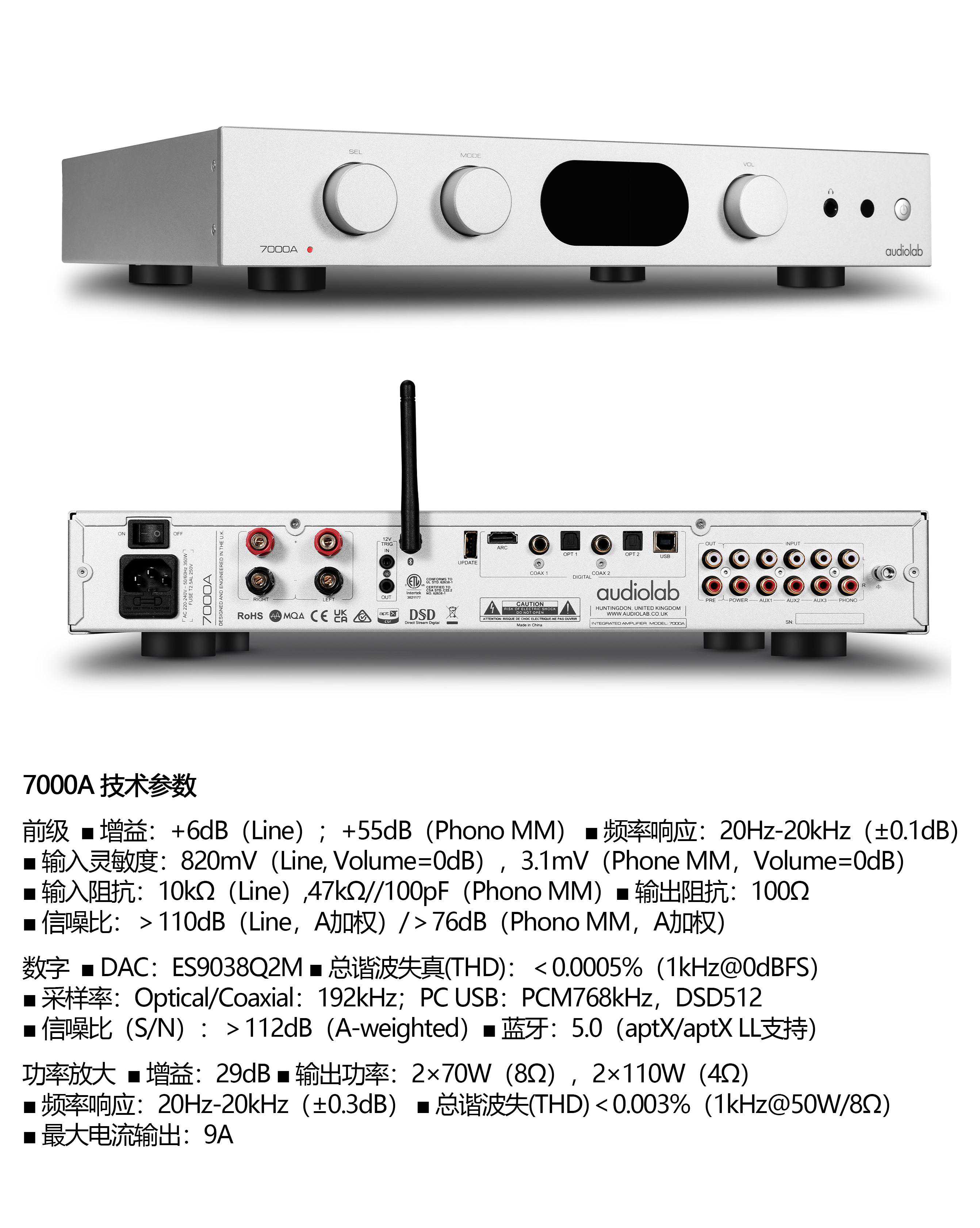 7000A则是一款解码功放一体机。除了为自家转盘提供优质解码效果外,7000A还搭载多种模拟/数字输入接口,7000A直接完全MQA解码,可展开三层MQA解析,并通过RoonTested认证,满足家中各种讯源、各种格式的播放需求。7000A配置了3组RCA和1组带MM唱头的模拟输入、1组功率输入供其他前级接入,2组光纤/同轴、1个PCUSB、1个带ARC的HDMI接口,12V触发器,并支持蓝牙。HDMI接口能够接入平板电视,增强家庭影音、游戏机的音质,让全家人都能够享受到高级音响带来的提升。7000A采用ESSES9038Q2M解码芯片,这是一颗动态范围128dB和120dB总谐波失真+噪声的高规格芯片,并使用ESS的32bitHyperStream架构以及TimeDomainJitterEliminator技术控制数据流传输的质量,将jitter时基误差降到最低。7000A支持同轴/光纤传输最高PCM192kHz格式,USB传输最高PCM768kHz和DSD512格式,覆盖所有主流文件格式,用户可通过7000A上播放所有音乐文件不必担心兼容问题。