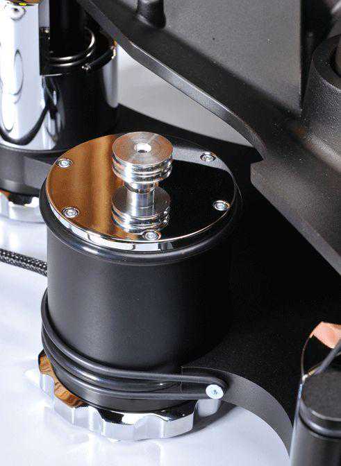 我们熟悉的LINN是通过底座内置三点弹簧悬浮的方式构成软避震结构的,其中遇到最大的问题是调校起来比较麻烦,需要专用的支架支撑后才能调校。而推出年代较新的AVID则设计了两层底座,底层三瓣式底座采用精密铸造方式制造,外沿设计了粗壮的悬浮脚座,对整体唱盘作前二后一的三点式支撑。精妙之处在于三个脚座内颇为复杂的结构,首先是每个脚座各内置一个螺旋弹簧作垂直方向的避震,其次再通过惰性胶圈作水平方向的限位固定,从而令转盘轴承底座悬浮于支脚底座上,彻底隔离了从机架等环节传导的震动干扰。
