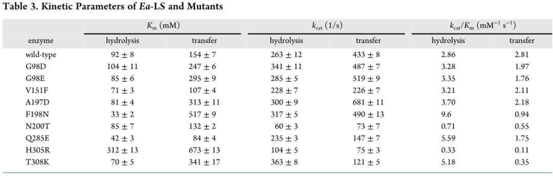WT酶和突变体的动力学参数如表3所示。水解和转移酶反应的Km分别表示为“KmH”和“KmT”。突变体H305R表现出KmH和KmT均增加,表明突变体H305R的蔗糖亲和力显着降低。相比之下,Q285E突变体显示出比WT酶增加的蔗糖亲和力,因为它的KmH和KmT都较低。突变体F198N显示KmH降低但KmT增加,表明与WT酶相比,它更喜欢水解蔗糖。突变体G98D、G98E和N200T都表现出与WT酶相当的KmH,而G98D和G98E的KmT增加了。