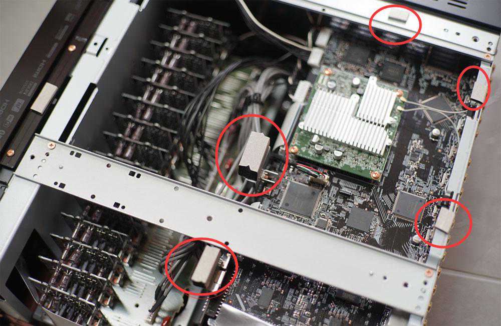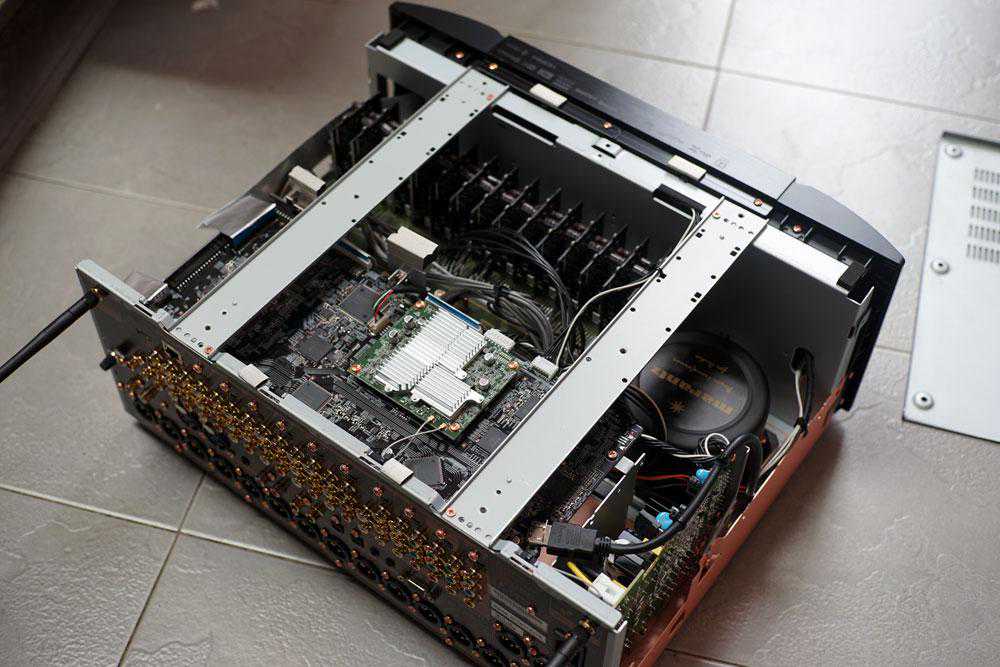 这样就全部拆开了,注意左边那一块一块的PCB卡,便是每声道的信号放大。