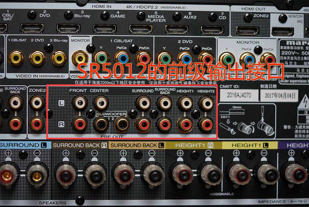马兰士SR6012的11.2声道前级输出接口,分LR左右声道,上下两排分布。